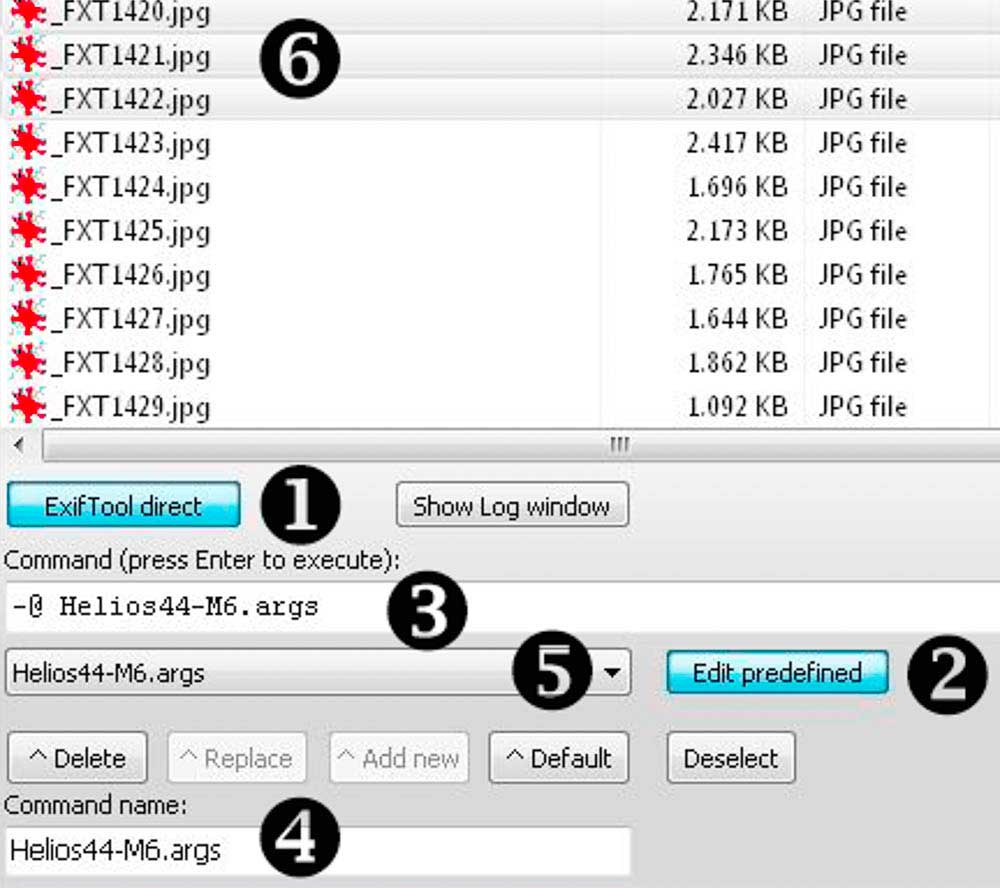 Neue Objektive können durch Kopieren hinzugefügt werden. Jede neu erstellte Args-Datei wird wie zuvor im Installationsverzeichnis abgelegt. Dort öffnet man die Datei ExifToolGUIv5.ini und kopiert im Abschnitt „ETdirectCmd“ jeweils die kompletten Dateinamen einschließlich Suffix zweimal hintereinander in eine neue Zeile. Zwischen den Dateinamen wird „=-@ “ (ohne Anführungszeichen) eingefügt. Elementar: die Leerstelle nach dem @-Zeichen.