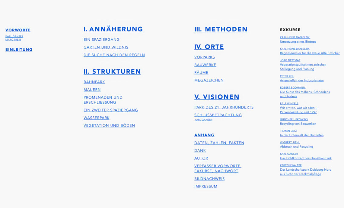 Die Annäherung an das Gegebene erfolgte primär über die Strukturen alter Schienen- und Wasserwege. Die Geometrie ihrer Verläufe wurde unverändert übernommen. Latz entwickelte Methoden zur Gestaltung: Gleistrassen machte er zu Promenaden und Alleen oder ließ sie als begehbare Stege in luftiger Höhe über Erzbunker laufen. Der Klarwasserkanal und die restaurierte Pfeilerbahn entlang der Emscherpromenade entwickelten sich zu einem weiteren Wahrzeichen des Parks. Neben alten Fotos illustrieren Skizzen im Buch die Visionen und ihre schrittweise Umsetzung, teilweise unterstützt von aktuellen Luftbildern. Besonders klar treten die umgenutzten Strukturen auf einem Winterbild hervor, dass dem Kapitel III vorangestellt ist. Erkunden lassen sich die neuen Wege zu Fuß und mit dem Fahrrad.