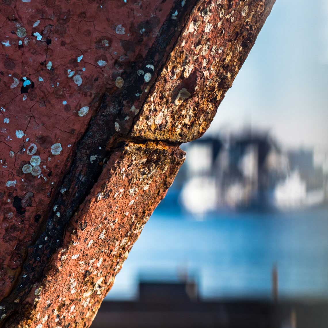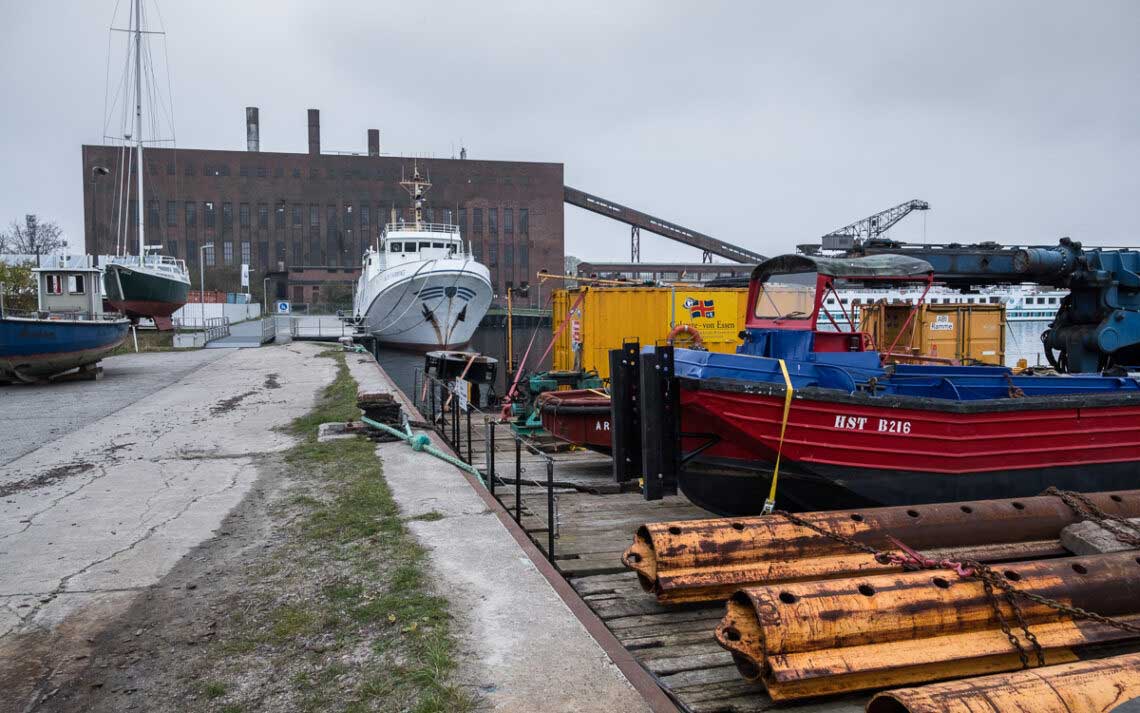 Um ein Gefühl für die Wirkung von Arbeitsblende und Brennweite zu gewinnen, hat sich bei den ersten Schritten ein Autofokus-Zoom bewährt. Anfangs erfordert die Bildkomposition einige Aufmerksamkeit, um den Rest kümmert sich die Kamera. Exif-Daten liefern in Verbindung mit der Bildwirkung Hinweise fürs weitere Vorgehen. Einmal mehr zeigte sich, dass viel Zoomen für die Gestaltung selten förderlich ist. Und in Verbindung mit zwei zu justierenden Spiegeln am Objektiv erst recht nicht. Die maximale Brennweite von 55 Millimeter ermöglichte auch an einer APS-C-Kamera noch nicht die gewünschte Wirkung. Bewährt hatten sich große Blendenöffnungen. Gute Voraussetzungen für das Nikon E 100/2.8, über das hier berichtet wurde. Im Hafen von Peenemünde fanden sich erste brauchbare Motive.