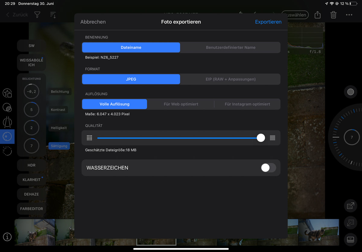 Der Exportieren-Dialog bietet die wichtigsten Funktionen, die man unterwegs mit dem iPad benötigt. Man kann ein JPEG, mit oder ohne Wasserzeichen, in voller Größe, für das Web optimiert (2048 Pixel lange Kante) oder für Instagram optimiert (1080 Pixel lange Kante) ausgeben. Alternativ exportieren Sie die Raw-Datei inklusive der Anpassungen im Capture One-Austauschformat EIP („Capture One Enhanced Image Package“).
