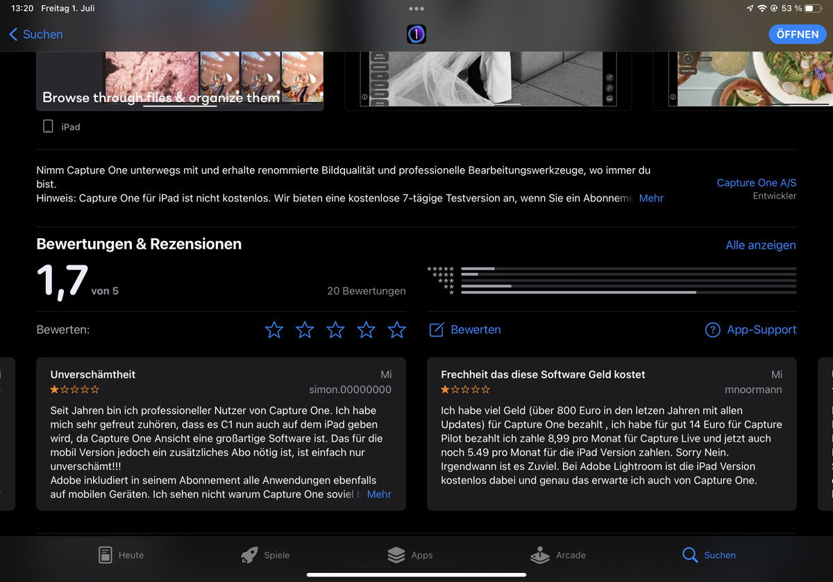 Im App-Store hat die App aktuell eine Bewertung von 1,7 von fünf Sternen (bei jedoch nur 20 Bewertungen, sodass man hier noch nicht von einem repräsentativen Wert sprechen kann). Hauptkritikpunkt ist das Abo-Modell, da Capture One allein für die iPad-App 5,50 Euro/Monat aufruft – zusätzlich zum Kauf oder Abonnement (220 bis 290 Euro/Jahr) der Desktop-Version: