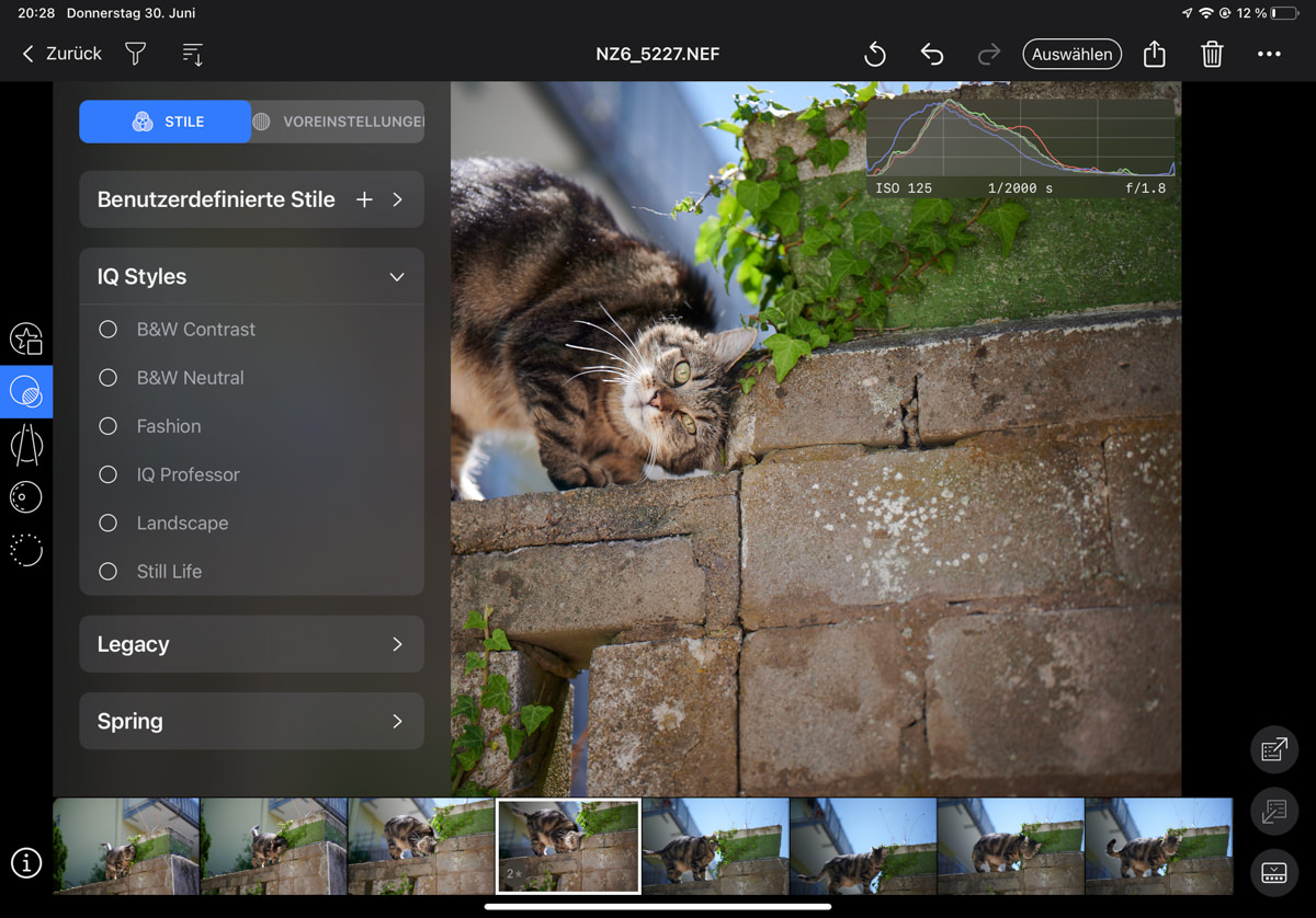 Positiv ist: Stile werden vollständig unterstützt, selbst wenn die zugrundeliegenden Funktionen in der iPad-Version noch nicht zur Verfügung stehen. Wurde ein Stil beispielsweise in der Desktop-Version unter Nutzung der Gradationskurve erzeugt, und auf dem iPad einem Bild zugewiesen, wird das Ergebnis korrekt angezeigt. Sie können auf dem iPad die Kurve nur nicht verändern, weil es diese dort noch nicht gibt.