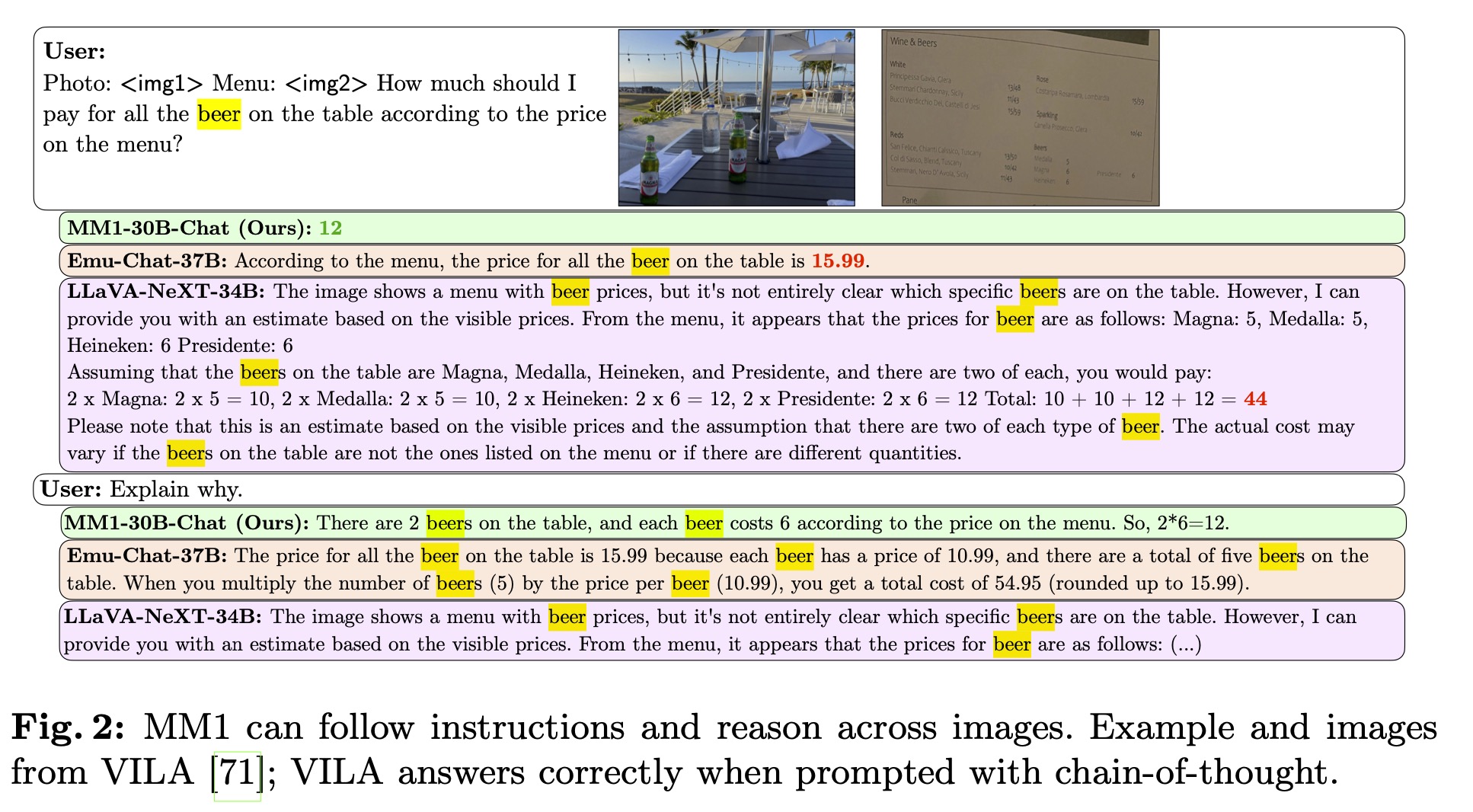 Ein eindrucksvolles Beispiel aus dem Paper: MM1 wird das Foto eines Restauranttisches mit ein paar Bierflaschen sowie ein Bild der Speisekarte vorgelegt. Auf die Frage, wie viel für „das ganze Bier auf dem Tisch“ zu zahlen wäre, liest das Modell den korrekten Preis ab und rechnet die Kosten zusammen: