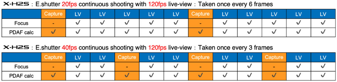 Die höhere Geschwindigkeit zeigt sich unter anderem im Serienbildmodus, in dem man (mit dem elektronischen Verschluss) nun bis zu 40 Bilder pro Sekunde aufnehmen kann – für 184 JPEGs und 175 Raw-Aufnahmen in Folge. Begnügt man sich mit 30 Bildern pro Sekunde, passen mehr als 1000 JPEGs und 270-Raw-Aufnahmen in den ebenfalls vergrößerten Pufferspeicher. Der mechanische Schlitzverschluss erreicht maximal 15 Bilder pro Sekunde; bei dieser Frequenz können 400 Raw-Aufnahmen in Folge geschossen werden (der Schlitzverschluss ist übrigens für mindestens 500.000 Zyklen ausgelegt). Bei einer Live-View-Bildfrequenz von 120 fps und einer Serienbildfrequenz von 40 fps kann die X-H2s im Serienbildmodus zwei von drei Frames im Sucher zeigen und jedes dritte Bild speichern; bei 20 Serienbildern pro Sekunde bleiben entsprechend fünf von sechs Frames für eine ruckelfreie Live-View übrig.