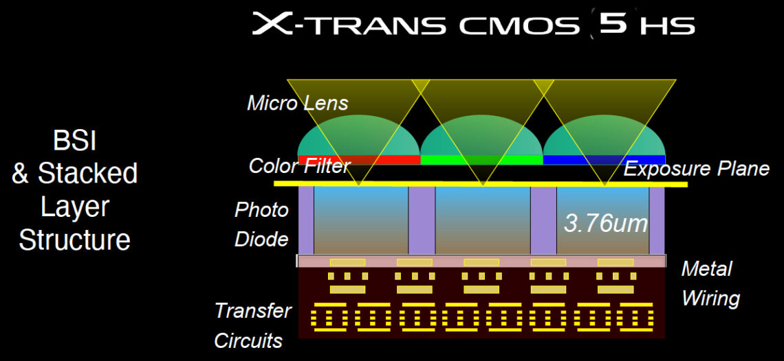 Zu den neuen Technologien der fünften Generation gehört zunächst einmal ein neuer Sensor mit Fujis X-Trans-Farbfiltermuster, der zwar wie bisherige Generationen 26 Megapixel auflöst, aber als „stacked“, also gestapelter Sensor eine zweite Etage hat, die nun Platz für die A/D-Wandler bietet. Normalerweise sitzen diese an einer der Längsseiten eines CMOS-Sensors, außerhalb der lichtempfindlichen Fläche, und sind jeweils für die Digitalisierung einer Pixelspalte verantwortlich. Dank des in der zweiten Ebene gewonnenen Platzes verfügt der Sensor über vier Mal so viele Wandler, die ihn mit der vierfachen Geschwindigkeit auslesen können, also vier Pixelzeilen in einem Rutsch. Der neben dem Schlitzverschluss verfügbare elektronische Verschluss arbeitet zwar wie bisher nach dem Rolling-Shutter-Prinzip, kann den Sensor aber nun in nur 1/151 Sekunde auslesen; bisher war dazu 1/40 Sekunde nötig. Rolling-Shutter-Artefakte bei bewegten Motiven oder gepulsten Lichtquellen dürften damit weitgehend der Vergangenheit angehören. Damit die Kamera den breiteren Datenstrom aus dem Sensor auch verarbeiten kann, ist eine entsprechend leistungsfähige CPU nötig, und ihr X-Processor 5 soll den doppelten Durchsatz bei einem halbierten Stromverbrauch bewältigen; KI-Verfahren auf Basis von neuronalen Netzen unterstützt er ebenfalls.