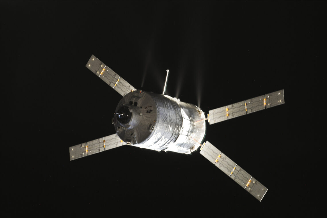 Orions Servicemodul basiert auf dem europäischen Raumfrachter ATV, dem mit einer Nutzlast von 7,7 Tonnen größten der unbemannten Raumfrachter, die bislang zur ISS geflogen sind – hier ist ATV-4 „Albert Einstein“ im Anflug auf die Raumstation zu sehen. Statt des 45 Kubikmeter großen Cargo-Bereichs des ATV treibt das Servicemodul nun eine Raumkapsel für vier Astronauten an. Schon das ATV hatte vier Solarmodule im X-Wing-Design. (Quelle: NASA)