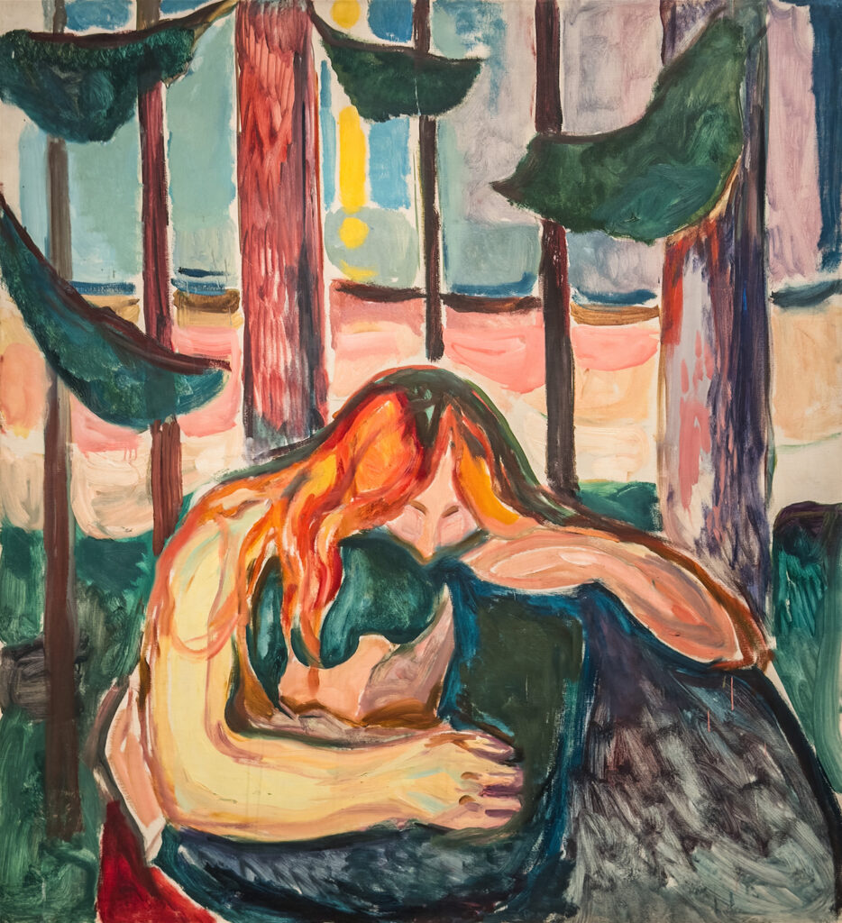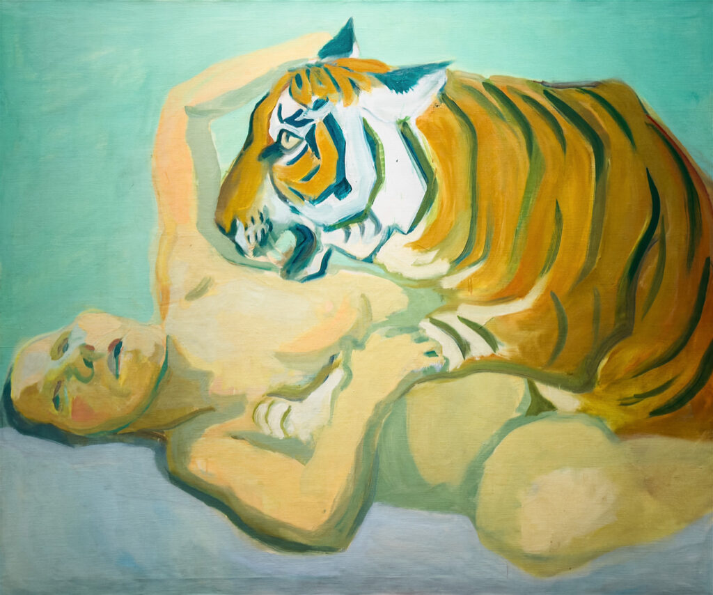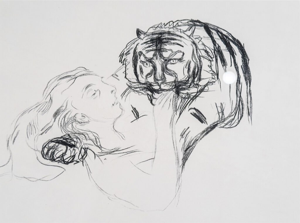 Die Präsentation macht sowohl die teilweise augenfälligen Korrespondenzen ebenso deutlich wie die Unterschiede in der Auffassung eines Themas. Für Munch sind Zärtlichkeiten zwischen Frau und Tiger (Der Tiger, 1909) eine romantische Affäre, die den Gegensatz zwischen Mensch und Tier überspielt; Maria Lassnigs Mit einem Tiger schlafen (1975) lässt dagegen keinen Zweifel daran, dass die Begegnung potentiell lebensgefährlich ist. Tatsächlich nimmt auch Munchs druckgrafischer Zyklus über Alpha und Omega, aus dem dieses Motiv stammt – in der Ausstellung ist er vollständig zu sehen – ein böses Ende, allerdings durch die tödlichen Folgen besitzergreifender Eifersucht statt durch die spitzen Zähne des Tigers.