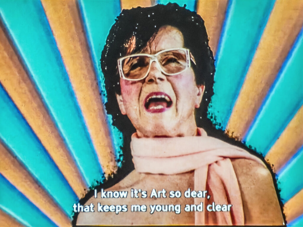 Ebenso wortwörtlich imaginiert sie sich 2011, also mit 92 Jahren, als vom Tode gezeichnet: Der personifizierte Tod malt ihr leichenhaftes Porträt mit geschlossenen Augen und offenem Mund.
