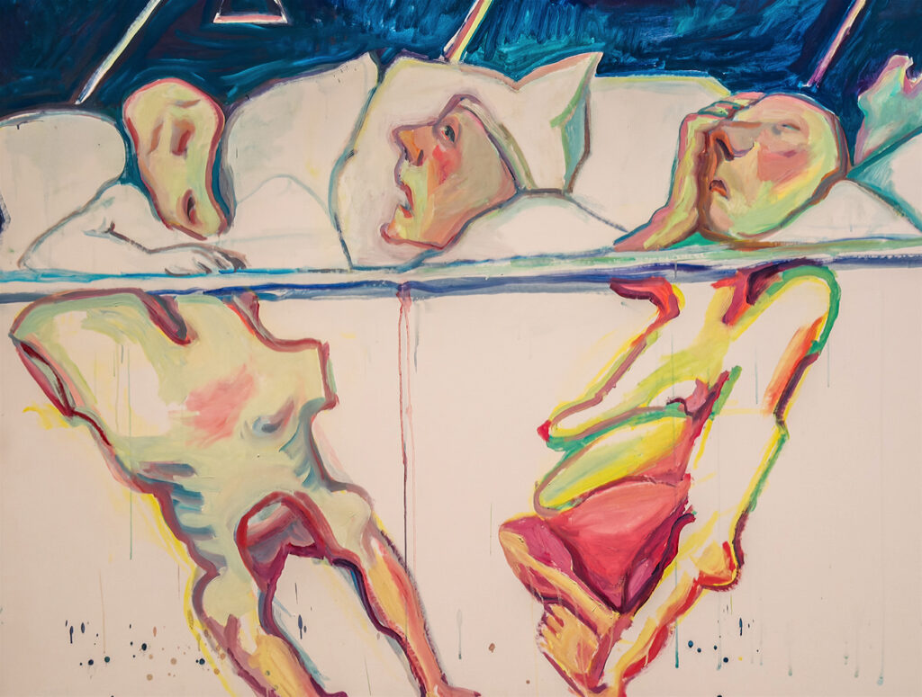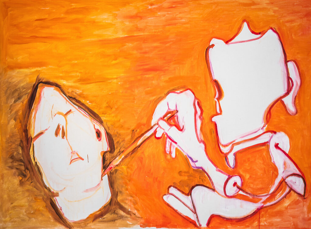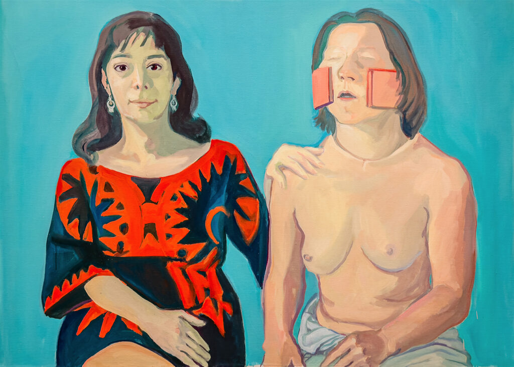 Wenn man durch die Ausstellung wandert, die sich über zwei Stockwerke der Galerie der Gegenwart erstreckt, fällt unwillkürlich auf, dass sich Munch und Lassnig einer ähnlichen Farbpalette zu bedienen scheinen; beide zeigen eine Vorliebe für Blaugrün- und Rottöne. Während Maria Lassnig ihre Motive aber gerne vor einem fast weißen Fond platziert, hat Edvard Munch das in seinen Gemälden nie getan.