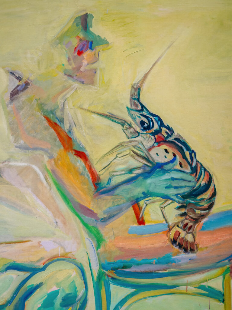Im Selbstporträt mit Stab, sieben Jahre später entstanden, ist der Balken oder Stab zerbrochen. Statt als Leiche tritt die Mutter nun aus einem Bild heraus als Geist hinter die Künstlerin, der ihr die Hände auf die Schultern legt und sie zu unterstützen scheint. Ihre an Hypochondrie grenzende Angst vor der Krankheit begleitete Lassnig allerdings noch lange. In einer für sie charakteristischen coping strategy fasste sie den drohenden Krebs wortwörtlich als riesige Garnele auf, die sie mühsam auf Distanz hielt.