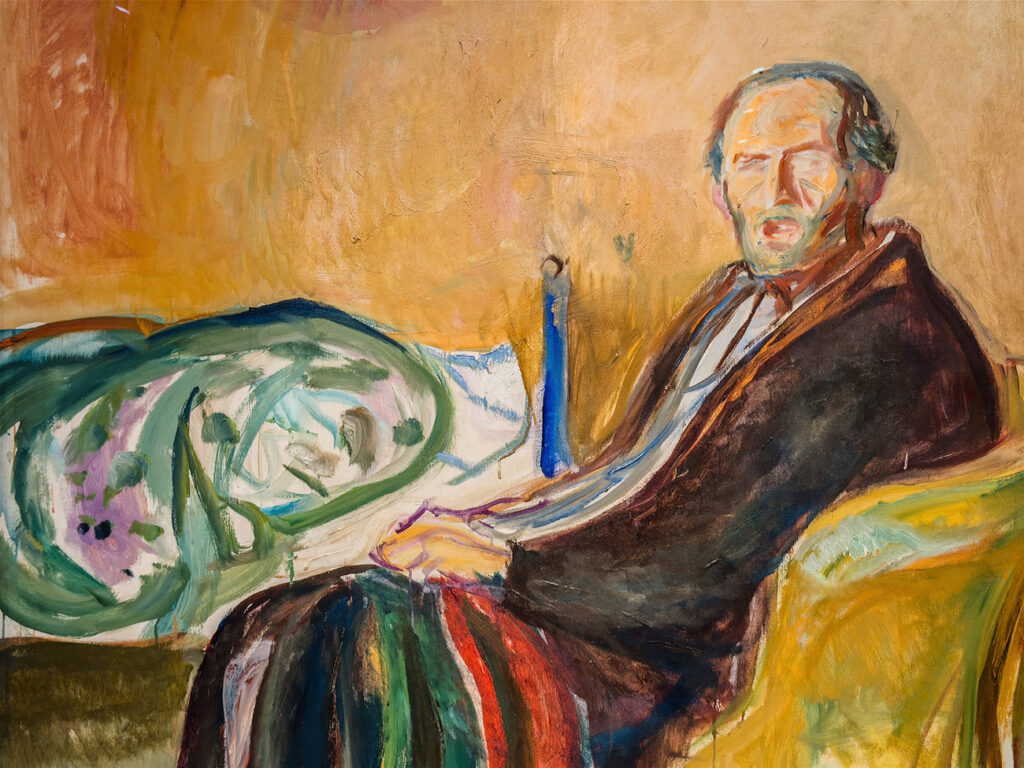 Edvard Munch erkrankte 1919 an der Spanischen Grippe. Die Pandemie, die weltweit bis zu 50 Millionen Todesopfer forderte, hatte ihren Ursprung übrigens nicht in Spanien, sondern vermutlich in den USA. Munch überlebte das Virus und malte sich, als er in der Phase der Rekonvaleszenz dazu in der Lage war, wirkt in diesem Bild aber noch immer wie vom Tode gezeichnet. (Dieses Gemälde soll nach der Ausstellung in Hamburg und ihrer zweiten Station in Zürich nie wieder ausgeliehen werden und dann nur noch in Oslo zu sehen sein.)