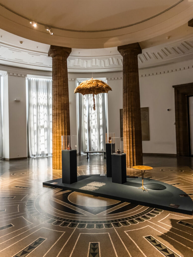 Der Spannbreite der Ausstellung und der Zahl der präsentierten Werke entsprechend benötigt sie viel Raum. Man beginnt den Rundgang im Hubertus-Wald-Forum im Altbau der Kunsthalle, das dem Thema Traum gewidmet ist; von dort gelangt man über eine Treppe, das Café Liebermann und die Passage (die Assoziation zu Walter Benjamins zur gleichen Zeit und ebenfalls in Paris entstandenem Passagenwerk ist beabsichtigt) in die Abteilung Wald, in der man Creatures of the Night aus Romantik und Surrealismus begegnet, woran sich eine Installation in der Rotunde anschließt. Im Treppenhaus wird der Film Un chien andalou von Luis Buñuel und Salvador Dalí präsentiert, wie heutzutage üblich mit einer Triggerwarnung (das zerschnittene Auge!), und eine Etage höher im Kuppelsaal erreicht man mit Kosmos den dritten und letzten Teil der Ausstellung.