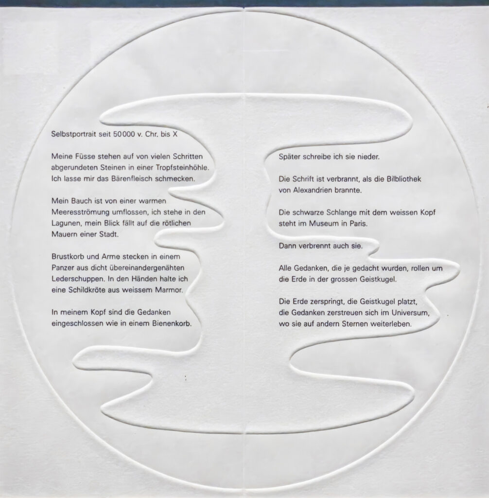 Dort sind auch Gedichte von Meret Oppenheim ausgestellt, die Mitte der 80er Jahre, kurz vor ihrem Tod, von Bettina von Arnim (1785–1859) und Karoline von Günderrode (1780–1806) inspirierte Werke geschaffen hat – die dazu gehörigen Gemälde sind in der Abteilung Traum zu sehen. Darin erweist sich das Zusammenspiel von Romantik und Surrealismus noch einmal, rund 50 Jahre nach der Hochzeit der Surrealisten, als unverändert produktiv.