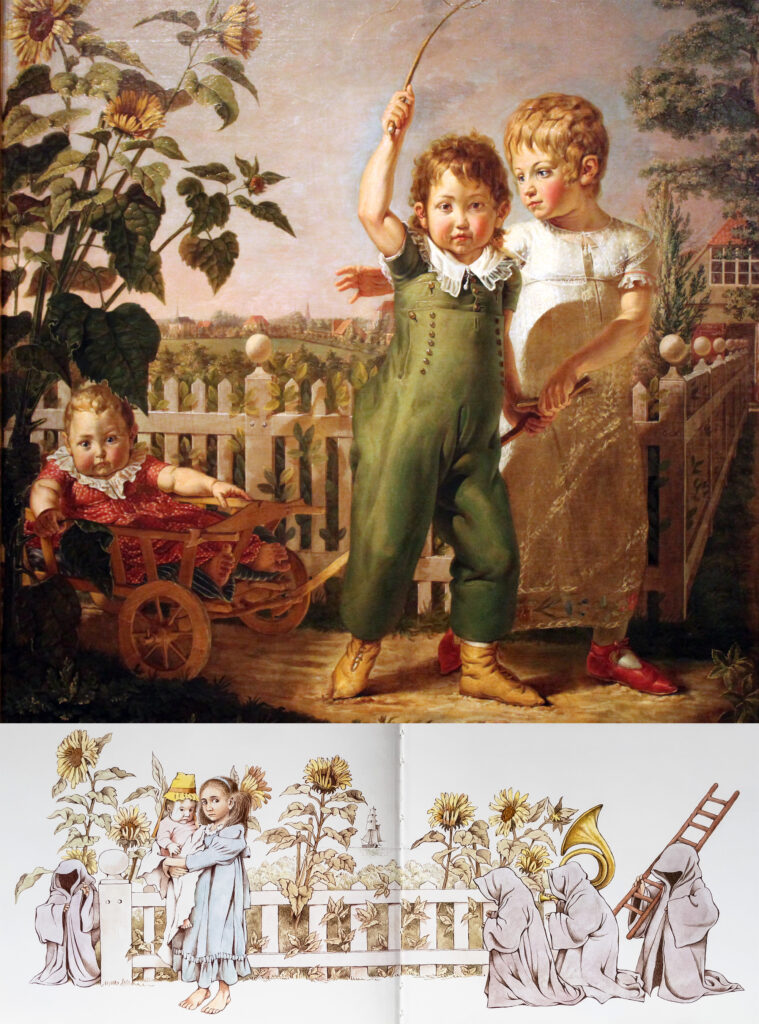 Ein weiterer möglicher Bezug scheint den Kuratoren entgangen zu sein: Philipp Otto Runges Die Hülsenbeckschen Kinder, das die drei Kinder von Runges Freunden vor ihrem Sommerhaus in Hamburg-Eimsbüttel zeigt (im Hintergrund sind die Türme von Hamburgs Hauptkirchen zu erkennen), ist in der Ausstellung zu sehen, und hier hätte man auf Maurice Sendak verweisen können, der Motive dieses Gemäldes in Outside Over There (Als Papa fort war) von 1981 zitiert hat.