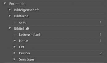 Toll ist übrigens, dass Ihnen Excire Search TT nicht Ihre bestehende Stichwörter-Hierarchie durcheinanderbringt, sondern die eigenen Schlagworte säuberlich – gegebenenfalls auch nach Sprachen – sortiert in einer eigenen Hierarchie unter der Bezeichnung „Excire (de)“ ablegt.