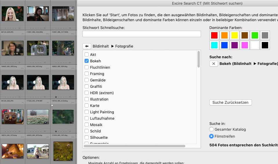 Mit Excire Search CT können Sie nach derzeit 500 Stichwörtern suchen, die auch Beschreibungen beinhalten, die man traditionell vielleicht nicht verschlagworten würde, wie hier im Beispiel „Bokeh“.