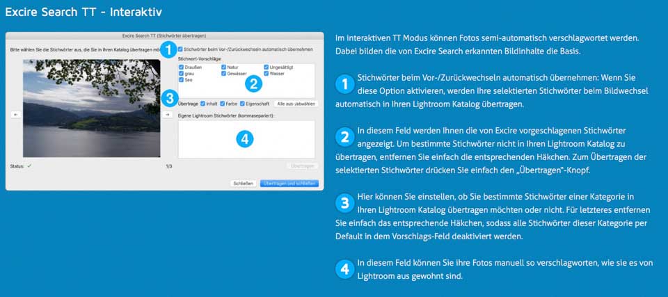 Excire Search TT bietet die Möglichkeit, erkannte Bildinhalte als Stichwörter in die Bilder des Lightroom-Katalogs zu exportieren. Foto: excire.com