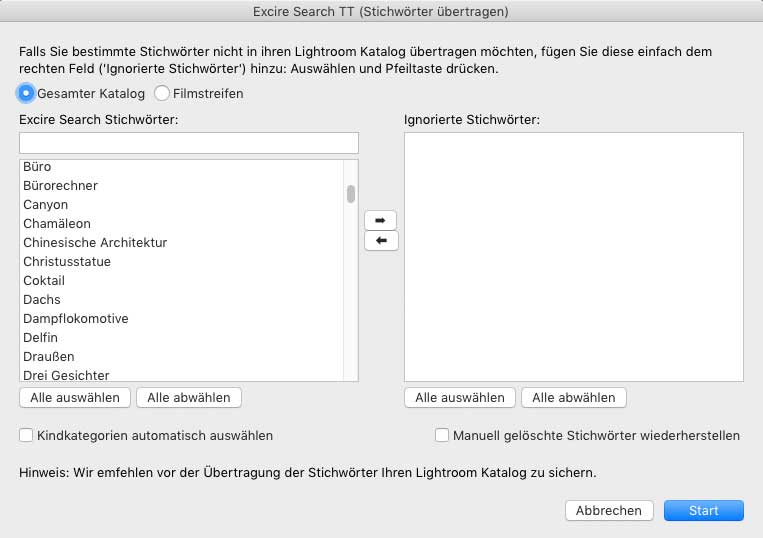 Bei der Stapelübertragung können Sie Stichwörter in alle oder nur ausgewählte Bilder schreiben lassen. Unerwünschte Stichwörter lassen sich im Dialog in den „Ignorieren“-Bereich verschieben, so dass diese nicht mit exportiert werden.