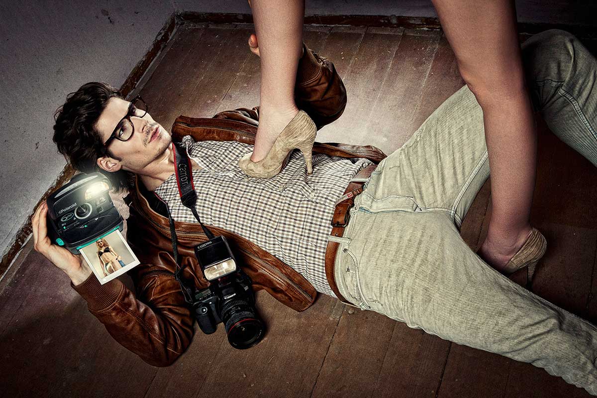 Meine Begeisterung für das Bild hält mich allerdings nicht davon ab, auch Kritik zu üben: Die Hand des Fotografen am Bein des Models ist mir für die Situation zu intim, da hätte eine ins Leere gehende Abwehrhaltung ausgereicht. Der Blitz der Polaroidkamera ergibt keinen Sinn. Die Schuhe des Models hätte ich mir noch high-heeliger, aggressiver und farblich weniger harmonisierend gewünscht. Schließlich ist die Verlagerung der Szene in einen Innenraum nicht plausibel, da ist die mitgedachte und mitgesehene Vorgeschichte nicht mehr stimmig, weil der Paparazzo dort seiner traditionellen Rolle kaum gerecht werden kann. (Wenn schon, dann hätte das Polaroid einen Blick durch einen Türspalt zeigen müssen.) Straßenpflaster wäre weitaus überzeugender gewesen.