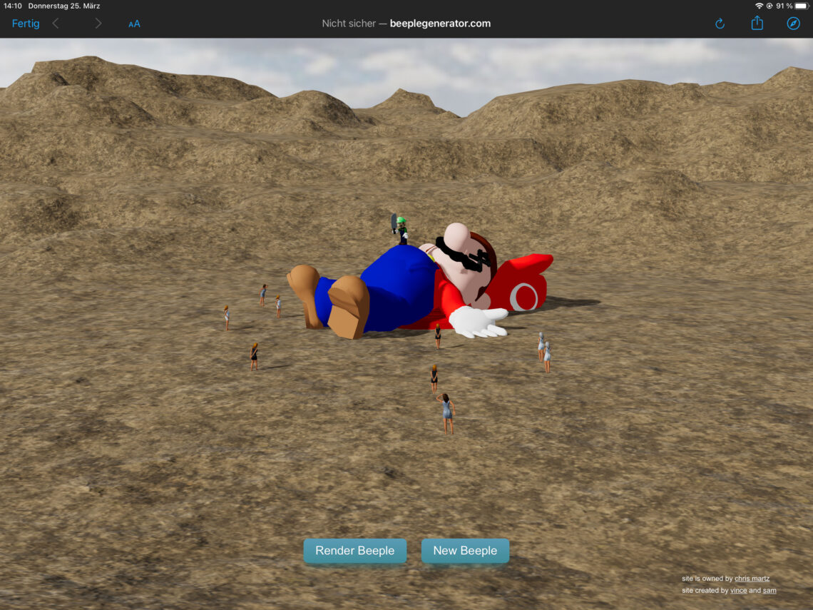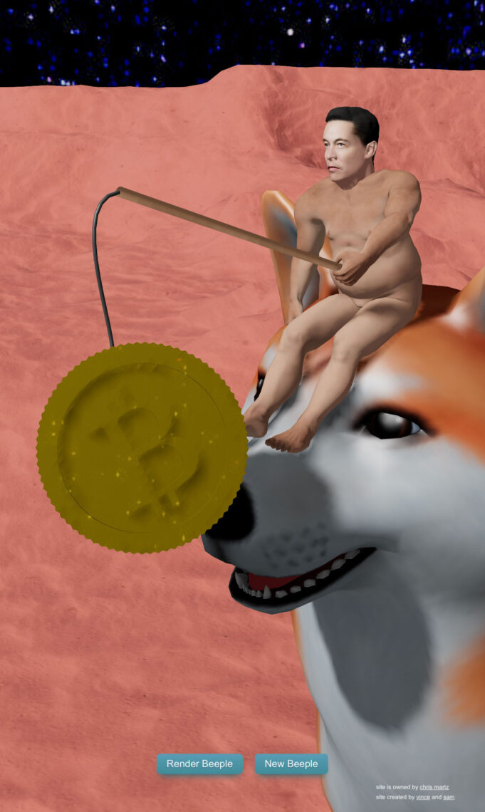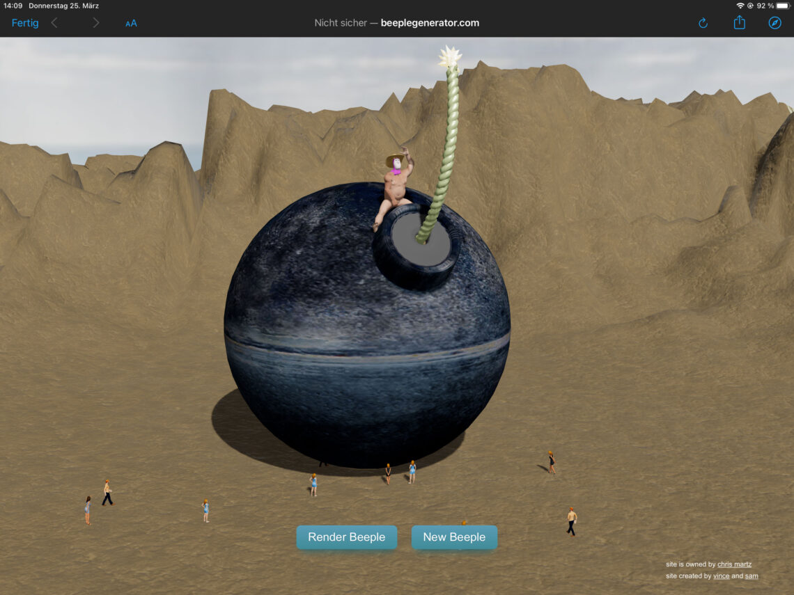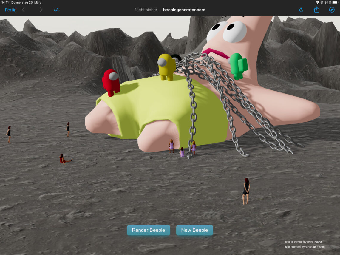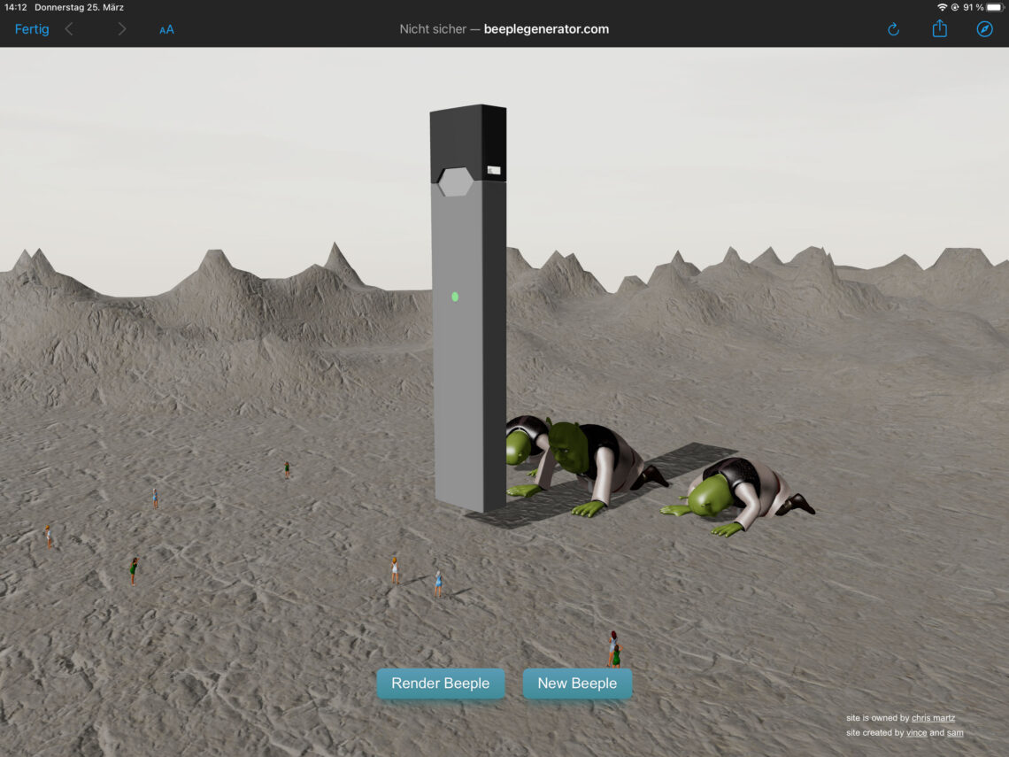 Anlass meines heutigen Blogbeitrags war jedoch der Beeple Generator, mit dem sich für Winkelmann typische Motive per Knopfdruck erzeugen und per virtueller Kamera arrangieren lassen. Allein schon die Idee und die Umsetzung durch zwei unabhängige Artists (vincemckelvie und samnewell1) verdient eigentlich eine eigene NFT-Versteigerung. Damit kann nun jeder täglich ein neues Everyday-„Kunstwerk“ erzeugen. 😉