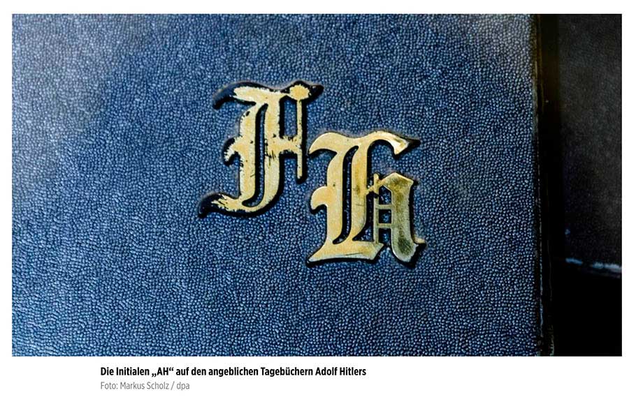Woher ich das mit der Leseschwäche weiß? Die Bildunterschrift zum Tagebuchdeckel lautet „Die Initialen »AH« auf den angeblichen Tagebüchern Adolf Hitlers“. Dort steht aber FH. Das war mir schon 1983 nach dem Erscheinen der Stern-Ausgabe aufgefallen, auf deren Cover diese Abbildung damals zu sehen gewesen war.