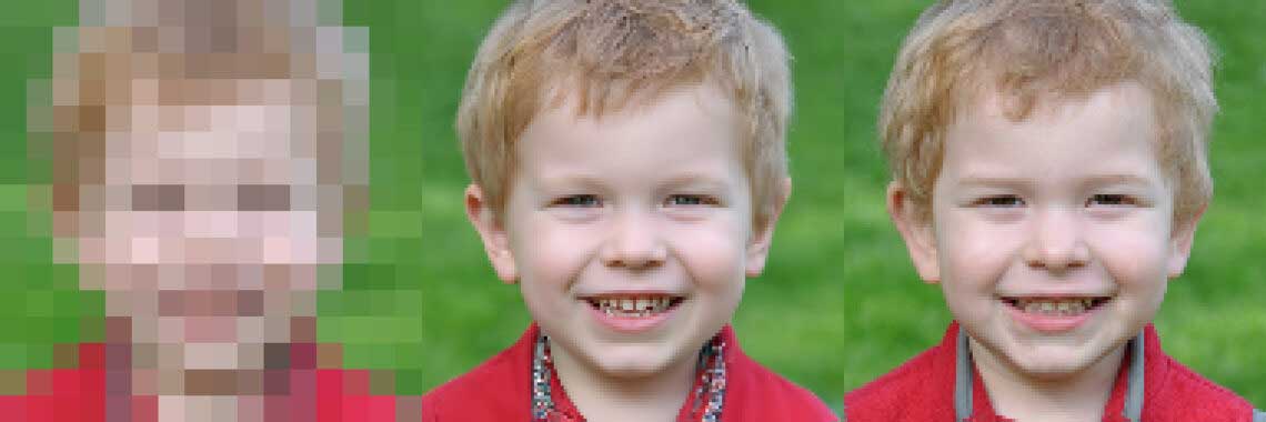 Die auf diesem Wege erzeugten Details sind natürlich bloß (mehr oder weniger) plausibel erfunden. Oft fällt das nicht weiter auf; dass die rekonstruierten Haarsträhnen des Kindes im folgenden Beispiel ganz anders als im Originalfoto aussehen, bemerkt man im direkten Vergleich; ohne diese Referenz erschiene die frei erfundene Frisur völlig akzeptabel: