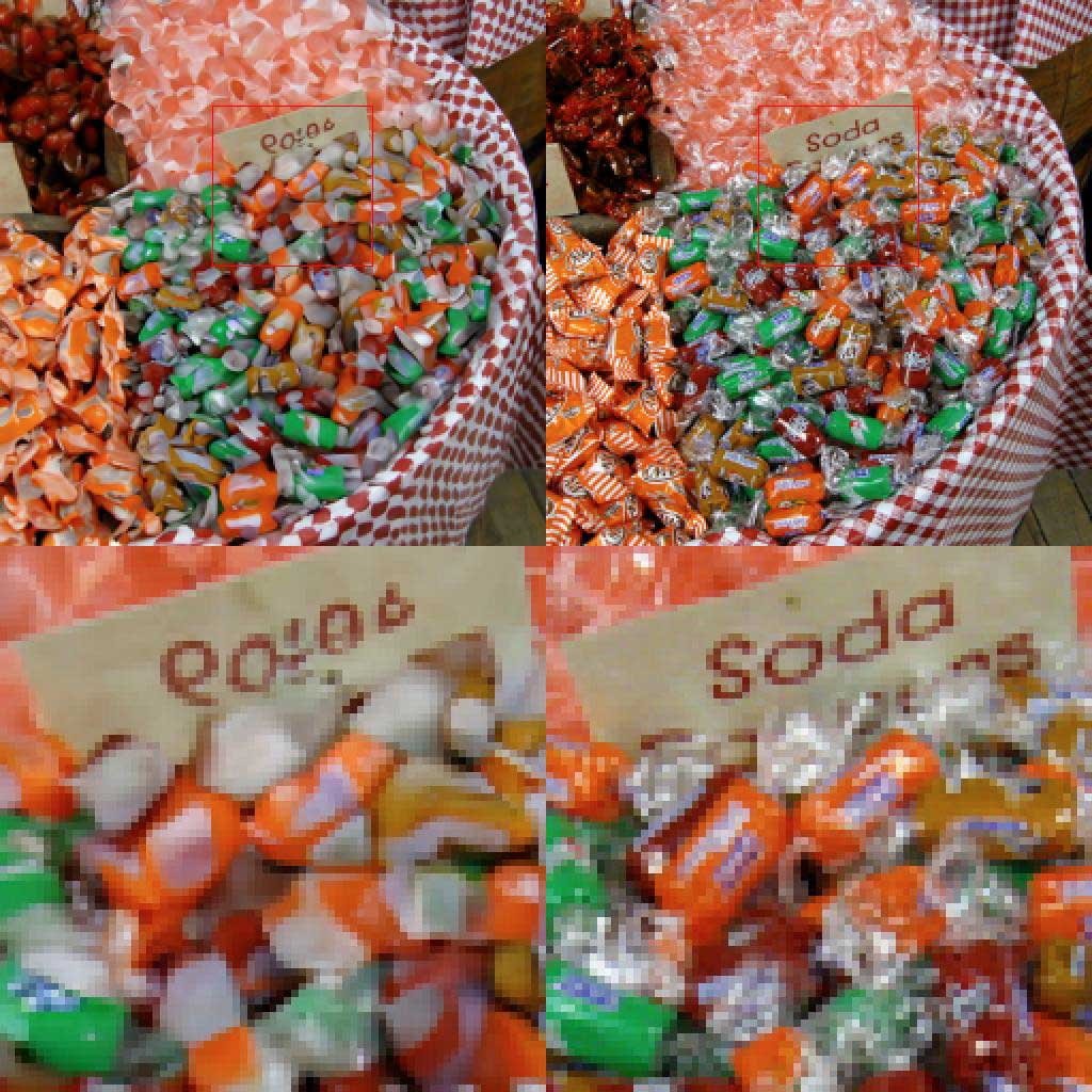 Hier hat SR3 zwar buchstabenähnliche Formen erzeugt, aber es kann nicht erraten, welches Wort (nämlich „Soda“) tatsächlich auf dem Schild steht. Auch die Bonbons scheinen dem neuronalen Netz nicht bekannt zu sein, weshalb ihre Rekonstruktion kaum Details zeigt.