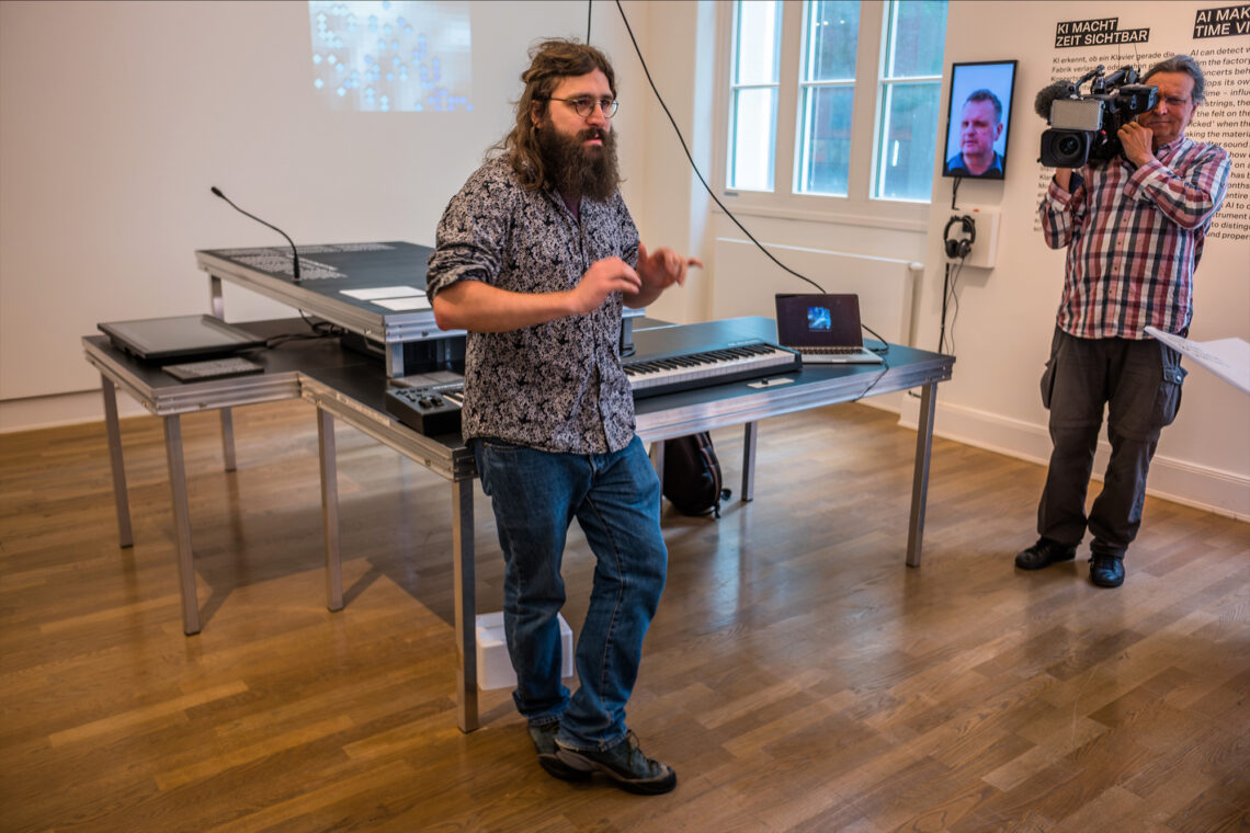 Die Ausstellung geht dann allerdings über die bekannten KI-Ansätze hinaus und zeigt, was stattdessen mit dem Verfahren des Physical Modeling möglich ist. Die Idee ist, das Verhalten einzelner Teile von Musikinstrumenten durch nichtlineare Gleichungen zu beschreiben und auf dieser Basis die Klangerzeugung zu simulieren. In ähnlicher Weise ist auch das Zusammenspiel mehrerer Musiker modellierbar, also wie beispielsweise improvisierende Jazzmusiker auf ihre Kollegen eingehen. Der Ausstellungsbesucher kann zu einer Musik tanzen, die er mit seinen Tanzschritten wiederum in Geschwindigkeit und Rhythmus beeinflusst; die Musik passt sich so dem Tänzer an. Übertragen auf die Bilddomäne entspräche dem Physical Modeling eher die 3D-Modellierung als der generativen KI als Methode zur Bilderzeugung.