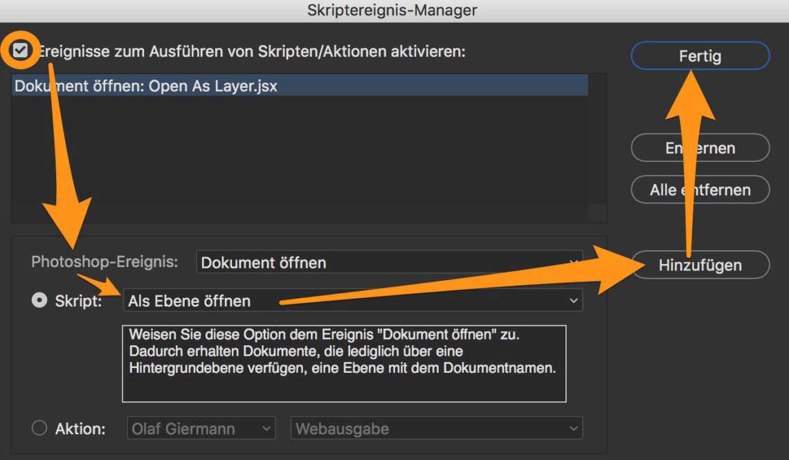 - Nehmen Sie die Einstellung wie auf dem folgenden Screenshot vor. Wählen Sie also als »Photoshop-Ereignis« »Dokument öffnen« und als »Skript« »Als Ebene öffnen«. Klicken Sie auf »Hinzufügen« und dann auf »Fertig«.