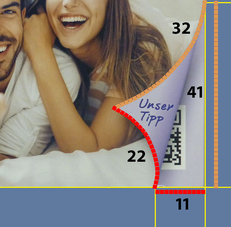 Das Hauptproblem ist immer dasselbe: Die Kanten der eingerollten oder umgeknickten Ecke können nie länger sein als die Strecke vom Beginn des Knicks bis zur Ecke des ursprünglichen Bogens. Bei einer einfachen Faltung um 180° sind sie exakt genau gleich lang, bei einer Einrollung oder wenn die Ecke nach oben steht, immer kürzer. In den Werbebeispielen jedoch sind diese Kanten oft deutlich länger als im Urspungszustand, und das kann nicht sein.