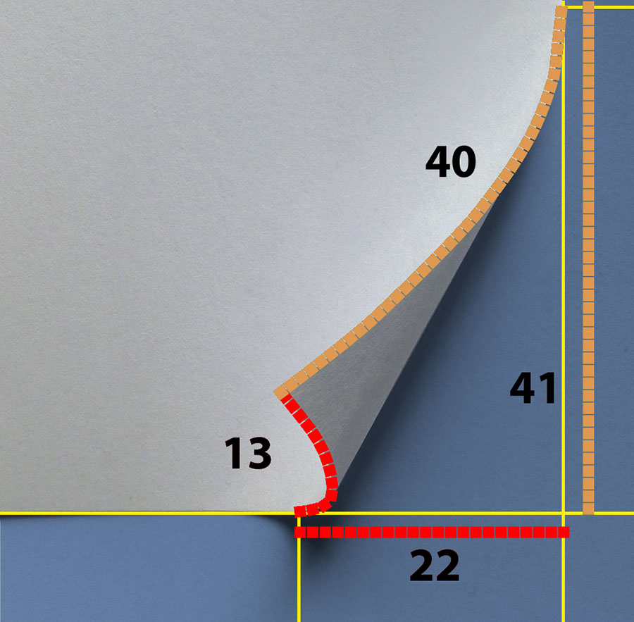 Da es in unserem Fall auf die absolute Länge nicht ankommt, habe ich nur die Quadrate ausgewählt. Beim fotografierten Knick ist die Länge von der ursprünglichen Papierecke zum Beginn des Knicks 22 Einheiten lang – eingerollt 13. Beim Werbebeispiel dagegen beträgt die Ursprungslänge 11 Einheiten, die der Rundung ist jedoch doppelt so groß, nämlich 22. Das führt dazu, dass die längere Kante nun nur noch 32 Einheiten lang ist statt der ursprünglichen 41, während sie beim fotografierten Papierbogen mit 40 Einheiten nur unwesentlich kürzer ist.