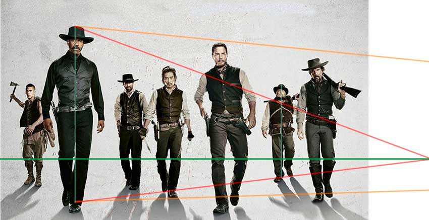 Die Annahme dieser Aufnahmehöhe folgt daraus, dass die Personen offensichtlich frontal aufgenommen wurden – man sieht etwa Kinn oder Nasenlöcher nicht von unten und die Schuhe von oben. Egal, an welcher Stelle man den konstruktiven Fluchtpunkt etwa für Denzel Washington platziert (der Schnittpunkt der grünen Horizontlinie mit den beiden blauen Fluchtlinien seiner oberen und unteren Begrenzung) – es ist unübersehbar, dass sich diese Konstruktion auf keine der anderen Personen übertragen lässt, sie sind alle viel zu klein.