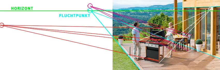 Schauen Sie sich dazu die Abbildung oben an: Die einzigen verlässlichen Objektkanten in diesem Bild sind die des Hauses und der Terrasse. Zieht man an ihnen entlang Fluchtlinien (blau), dann treffen die sich korrekt auf einer Höhe, wo man auch den Horizont (grün) erwartet. Bereits der Tisch und die Stühle weichen davon leicht ab; ihr Fluchtpunkt liegt leicht über dem Horizont.