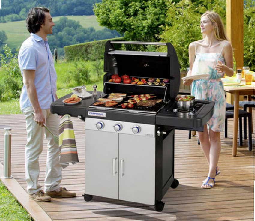 Dass der Grill einmontiert und nicht mitfotografiert ist, ist eindeutig. Dazu bedarf es nicht einmal komplizierter Rekonstruktionen – es reicht, wenn man auf derselben Webseite ein anderes Grill-Modell sieht, dass in die ansonsten völlig unveränderte Szene montiert wurde. (Oder die beiden Models schaffen es, völlig unbewegt zu verharren, bis ein anderer Grill vor ihnen steht – vergleichen Sie dazu das Bild am Ende dieses Beitrags.)