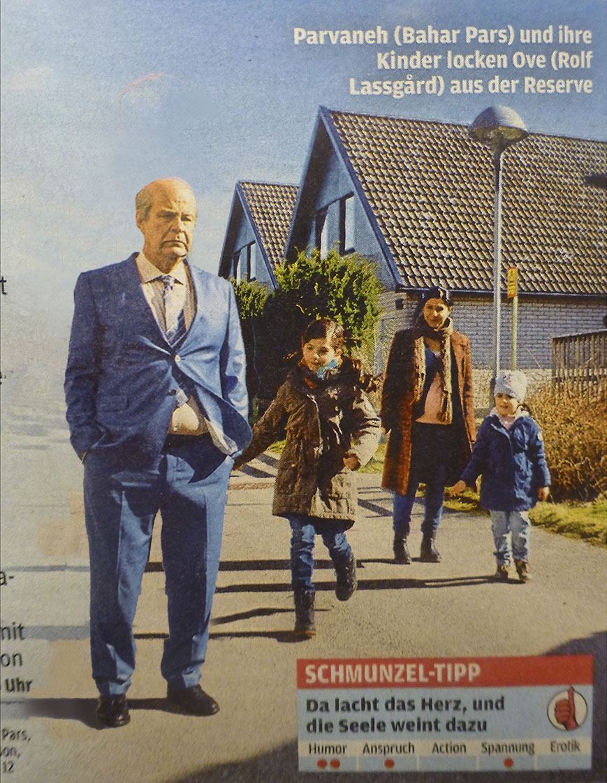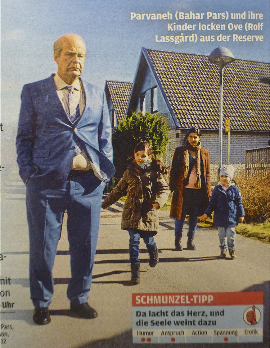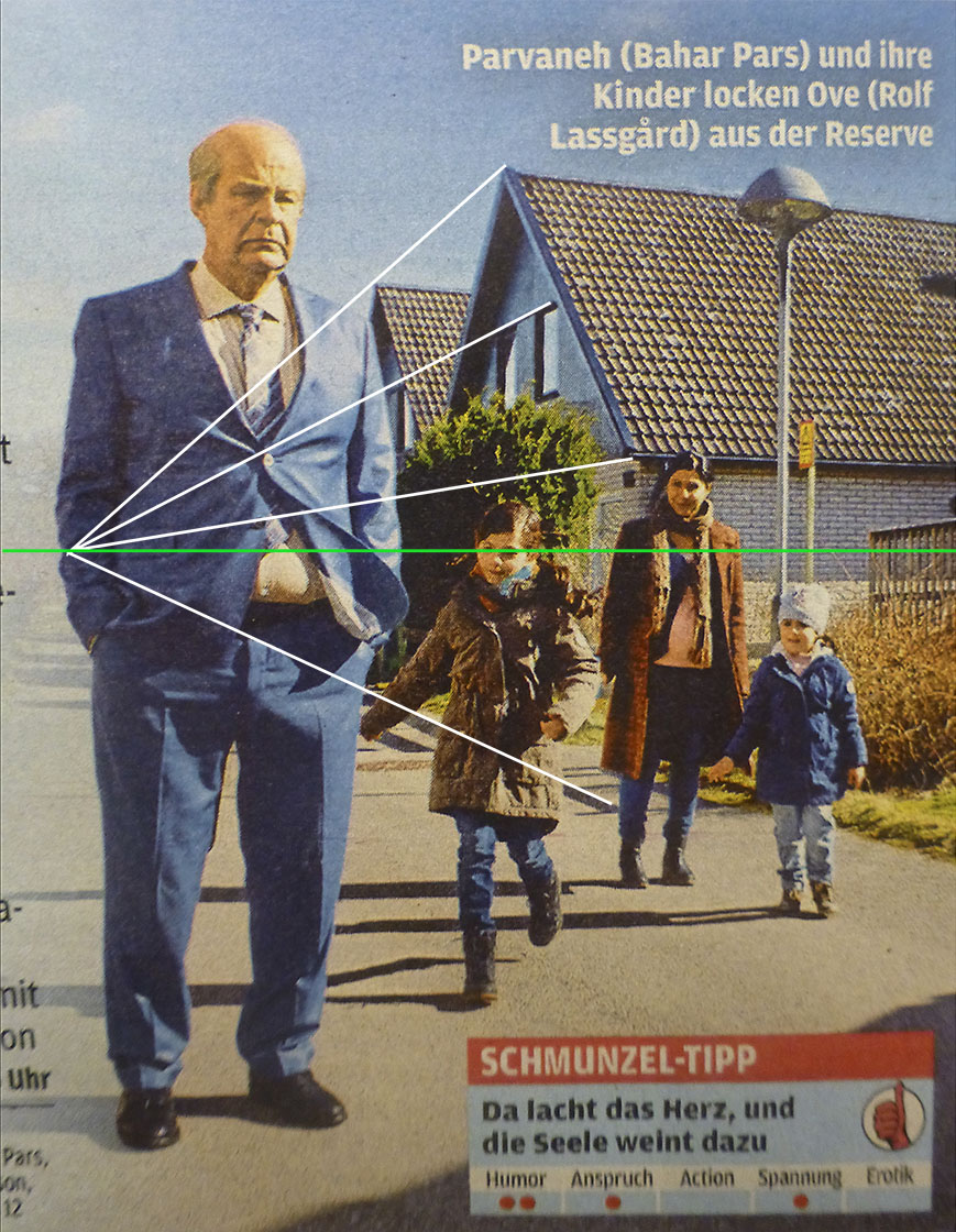 Kürzlich lief die Filmkomödie „Ein Mann namens Ove“ im Fernsehen, und die TV-Zeitschriften kündigten ihn mit einem vom Verleih bereitgestellten Bild an. Anlass für unseren Leser Hendrik aus Lübeck, sich bei Doc Baumann über diese perspektivewidriger Montage zu beschweren – „der wächst doch über sich selbst hinaus und damit auch über seine ganze Umgebung“ –, verbunden mit der Bitte zu erklären, was und warum hier falsch montiert wurde.