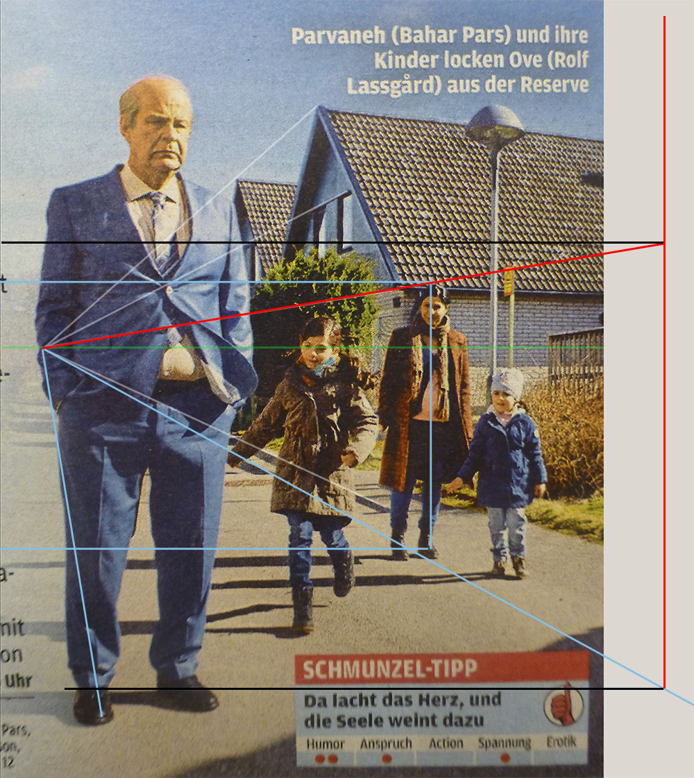 Im zweiten Schritt ziehen wir eine neue Fluchtlinie vom Fluchtpunkt zur Ferse der Frau (blau), eine weitere zu ihrem Kopf (rot); dann vom Scheitel und Fuß zwei waagerechte Linien nach links. Verlängert man diese Fluchtlinien nach „vorn“, also im Bild rechts, lässt sich aus ihrem Abstand dort ermitteln, wie groß die Frau sein müsste, wenn sie weiter vorn stünde. Befände sie sich nun neben Herrn Ove, läge ihre obere und untere Begrenzung zwischen den beiden schwarzen Linien. Doch direkt neben ihm würde sie ihm gerade bis zur Brust reichen, was ja wohl nicht sein kann …