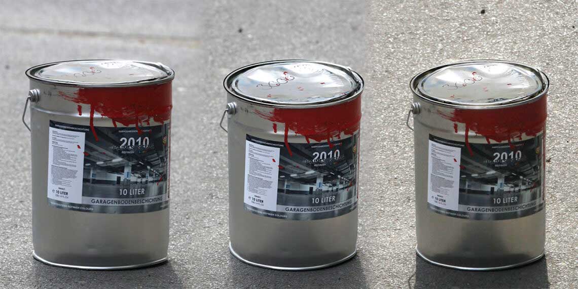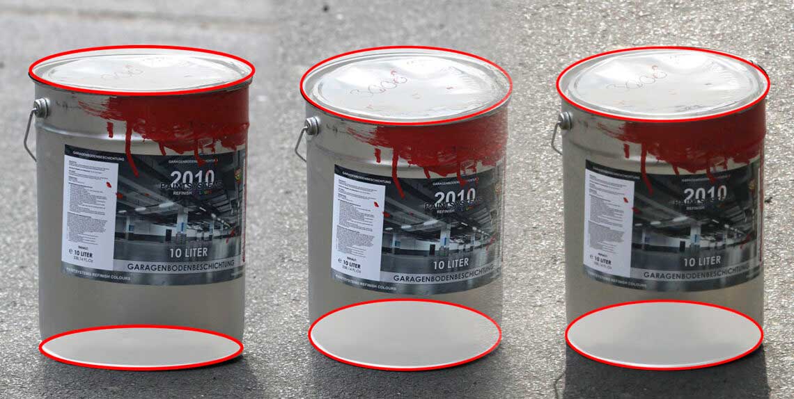Die beiden von mir zur Probe fotografierten Dosen – genau genommen ist es ein Farbeimer, weil ich ein etwas größeres Objekt benötigte – links im folgenden Bild sind etwa 1,5 Meter entfernt; die linke flacher, die mittlere weiter von oben aufgenommen. Die dritte, wie man sieht, noch ein wenig mehr von oben. Aber seltsamerweise sieht die nun so aus wie die Farbdosen aus der Werbung. Warum?