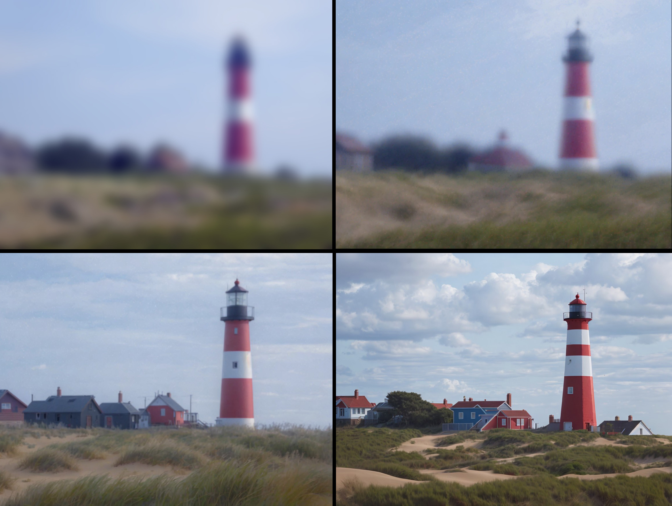 Bild 4 | Prompt: »professional photo, a lighthouse with white and red horizontal stripes, dunes with some plants in the foreground, two small houses with red roofs in the dunes, blue sky with a few weak clouds« / Original – evolve Photoc 40, 60, 90% – nur Prompt ohne Referenzbild mit KI-Modell Photonic – mit KI-Modell AIVision