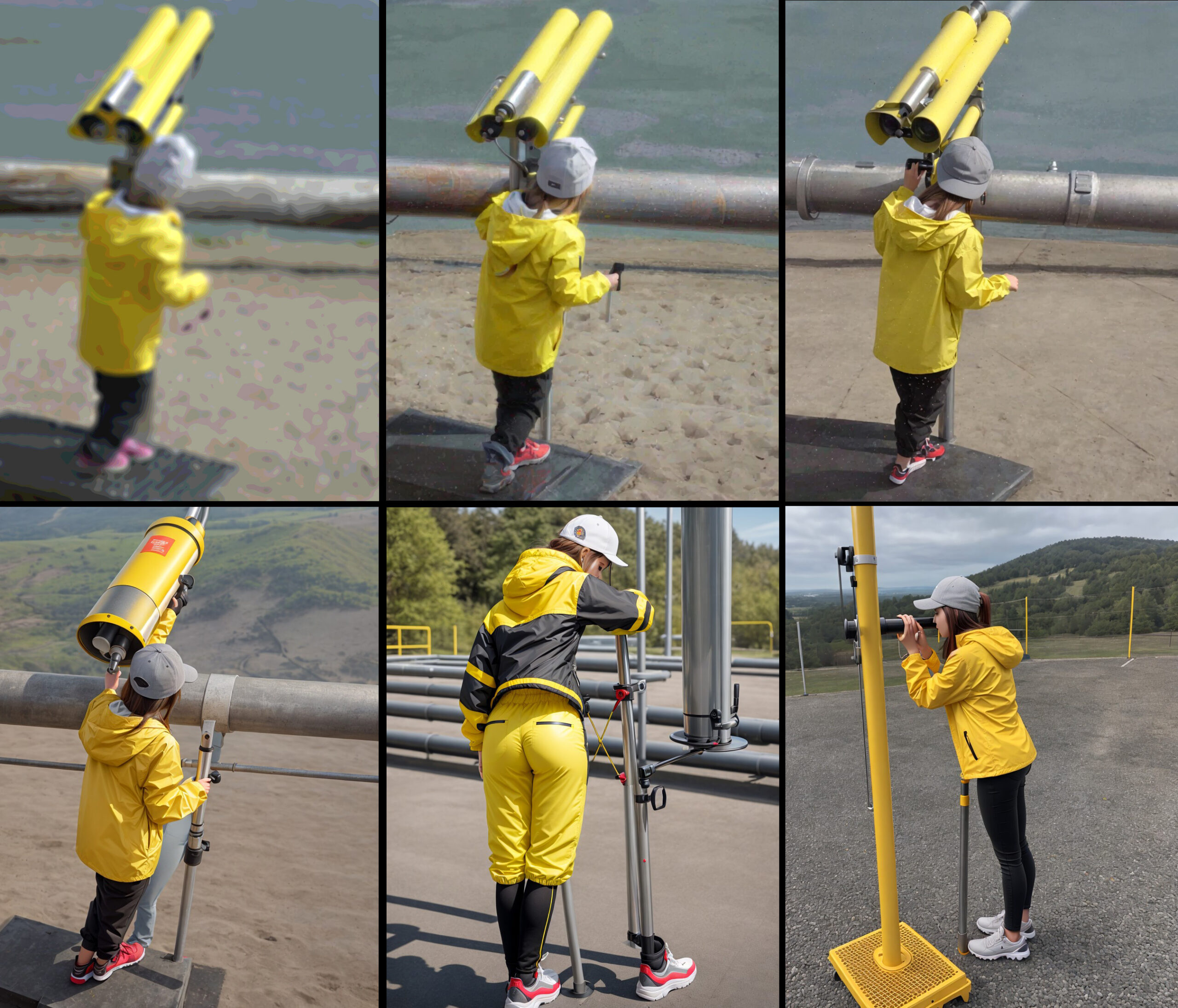 Bild 2 | Prompt: »professional photo, a little girl, 3 years old, seen from behind, wearing a gray cap, yellow windbreaker, black pants, red shoes, the girl is standing on a metal grid, she is holding on to a vertical metal bar, at the top and behind A yellow telescope with two tubes is attached to her, behind the girl and the telescope there is a strip of gravel on the ground, above it a raw hpozontal wooden beam, in the background the pale green sea with a high horizon«. / original – evole: Photonic 50, 60, 80%