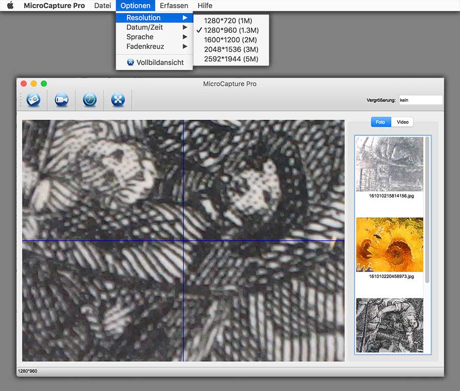 Für die Ausgabe lassen sich in der Software MicroCapture Pro verschiedene Dateigrößen vorgeben.