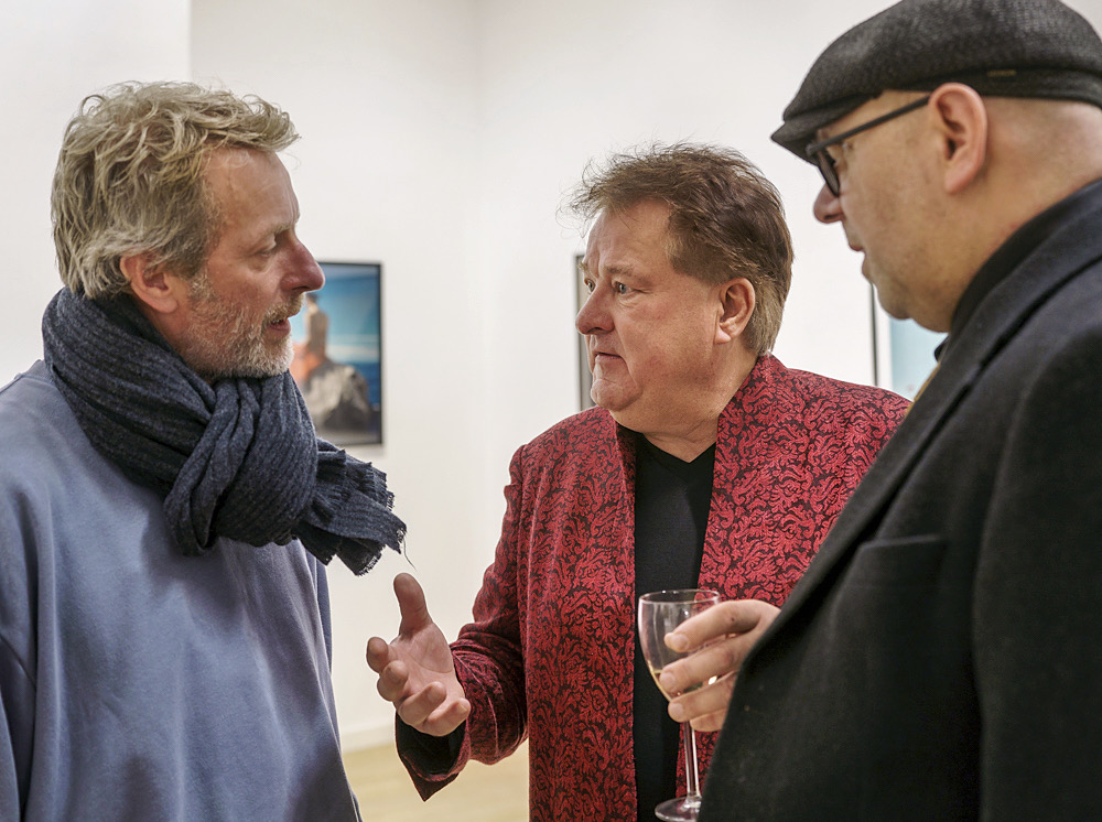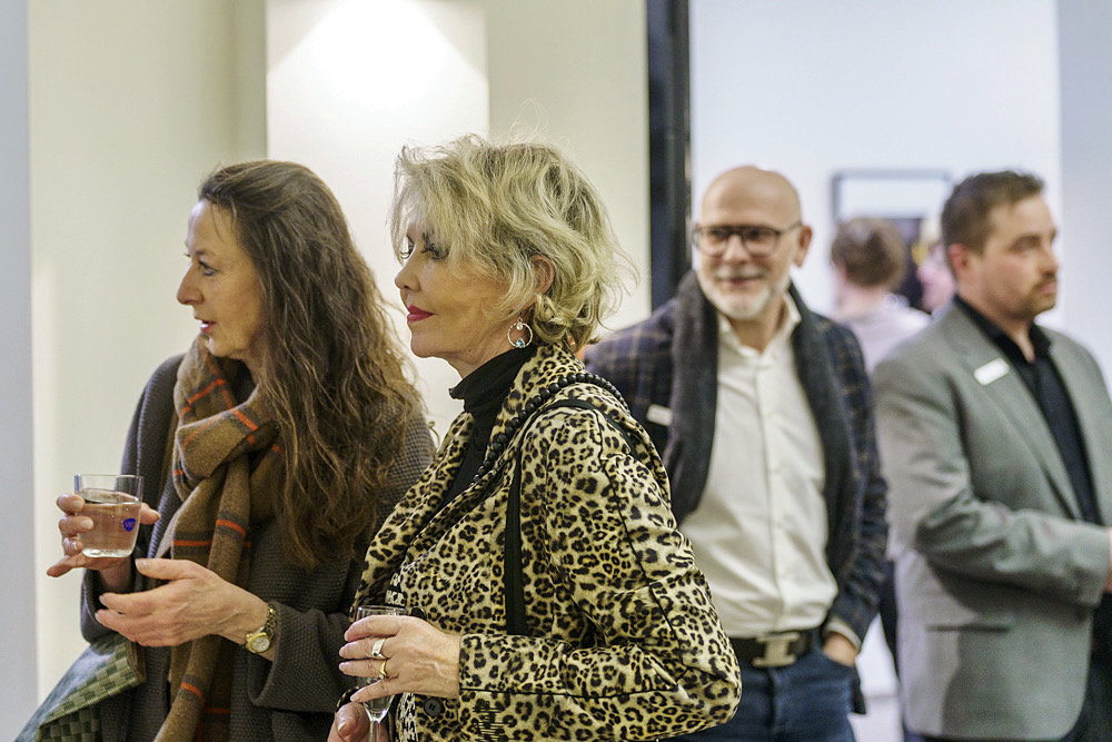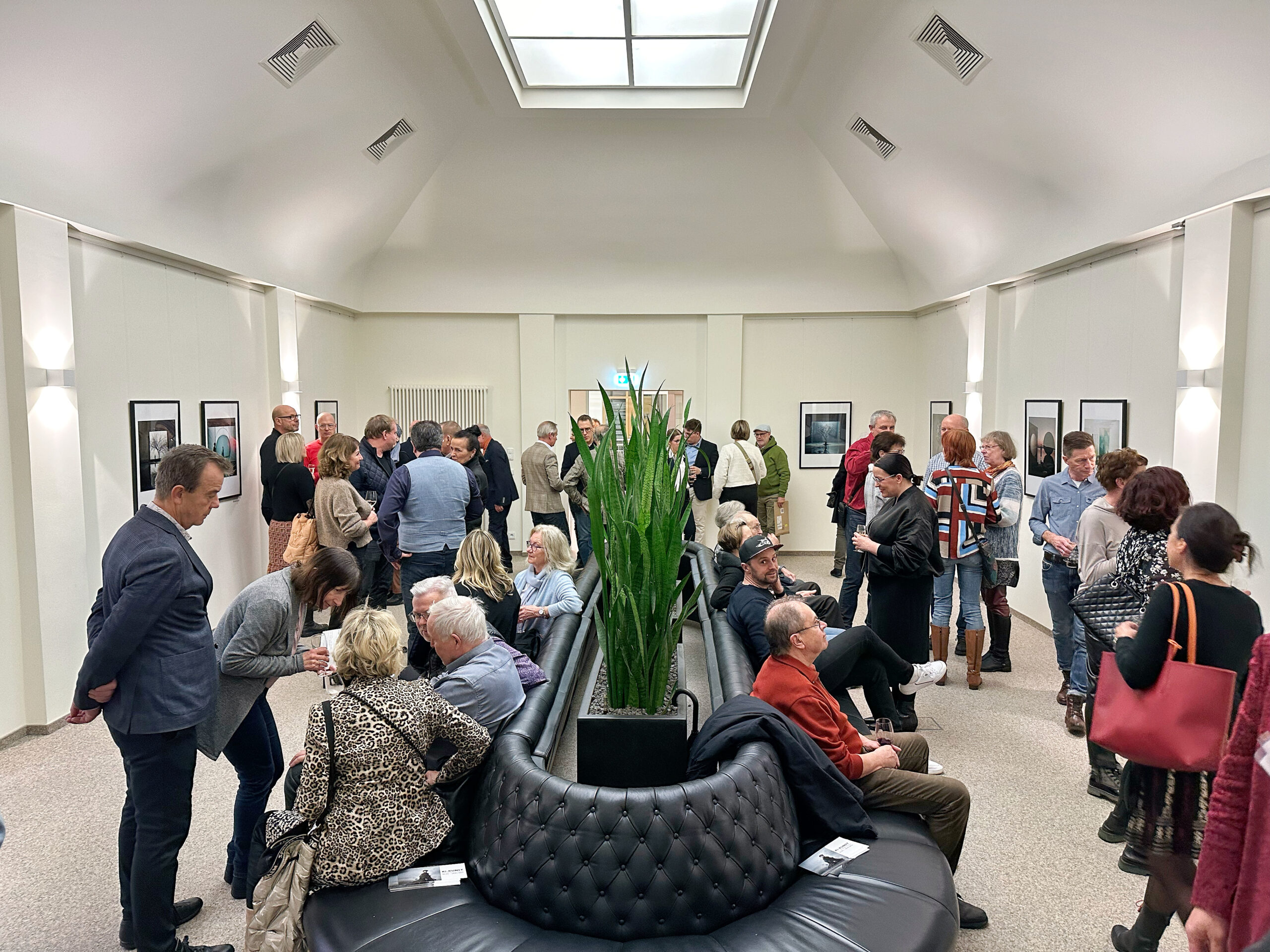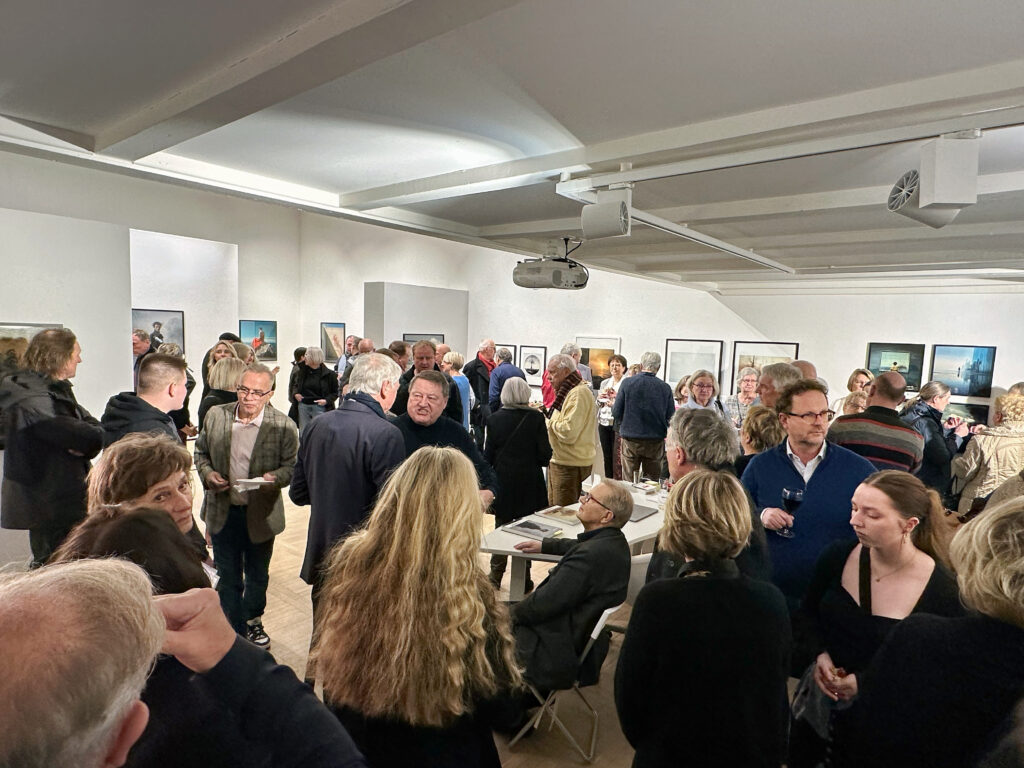 Anschließend verlagerte sich das Geschehen in die Galerie STP, wo bei Wein und Häppchen die Auseinandersetzung mit dem Thema weiter vertieft wurde. Der Galerist Peter Konschake gab gemeinsam mit dem Medienkünstler Christoph Künne eine kurze Einführung in die ausgestellten Werke. Vertiefende Einzelgespräche mit den Gästen boten Gelegenheit, weiter in die Welt der KI-Kunst einzutauchen und die komplexen Prozesse hinter den Kunstwerken zu verstehen.