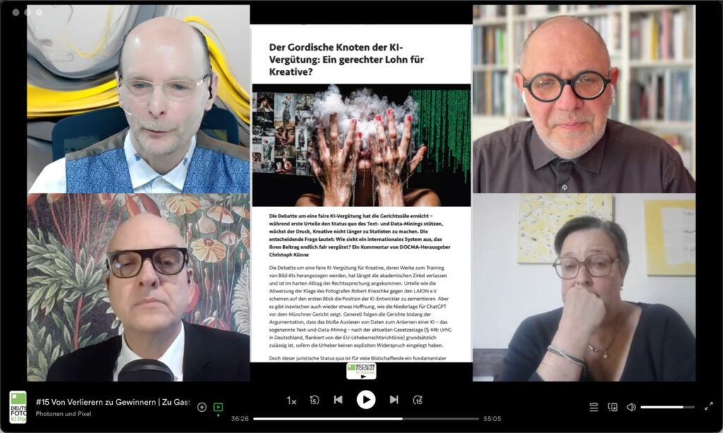 Wie lassen sich KI-Training, Nutzung und Vergütung fair regulieren? Fotografen geraten ökonomisch unter Druck, besonders bei Brot-und-Butterjobs und hybrider Postproduktion. Die Gäste – ab Minute 23:45: Dr. Anke Schierholz, Leiterin der Rechtsabteilung der VG Bildkunst und Christoph Künne, Kulturwissenschaftler und Mitbegründer des DOCMA Magazin