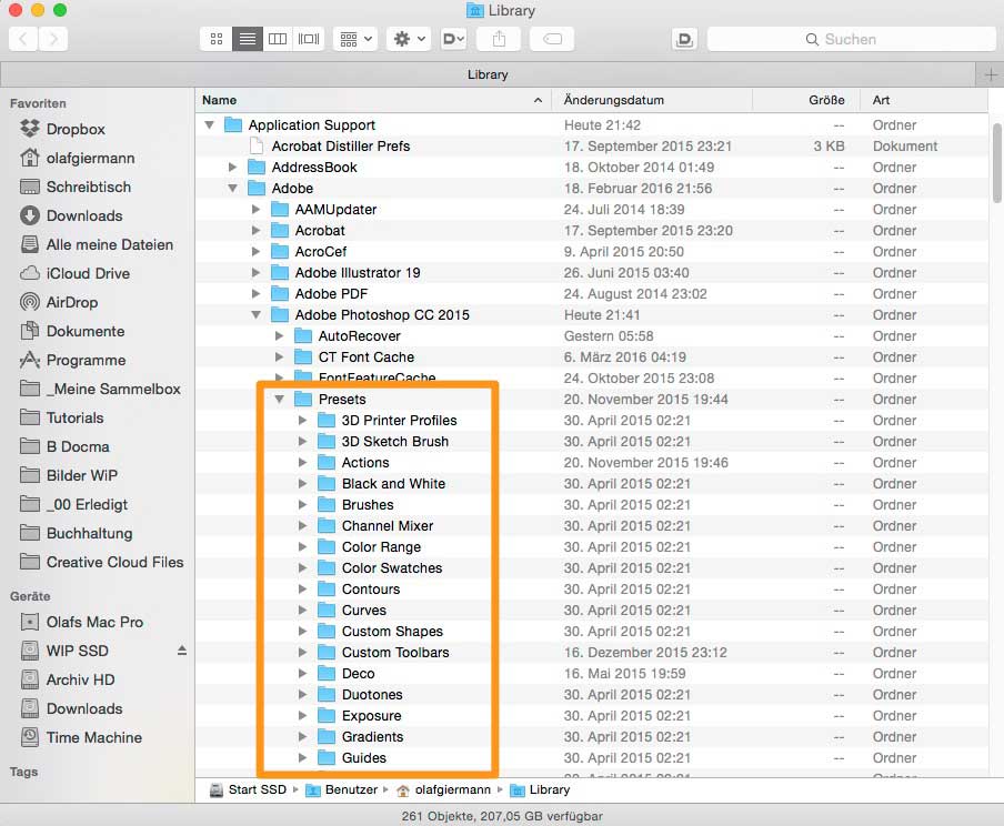 Nun bekam ich häufig die Frage beziehungsweise den Hinweis von Mac-Usern, dass die ganzen Ordner fehlten, die unter dem angegebenen Datei-Pfad vorhanden sein sollten; also Ordner wie Actions, Brushes, Lighting Effects, Styles und so weiter.