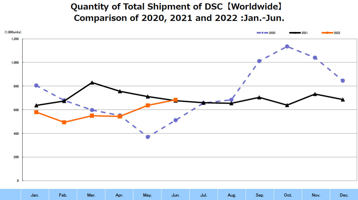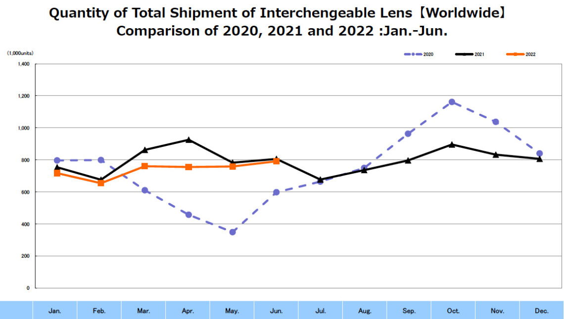 In diesem Jahr lagen die Kamera-Verkaufszahlen durchweg noch unter denen von 2021; nur im Juni wurden so viele Kameras wie im selben Monat des Vorjahrs abgesetzt. Die Zahlen für die Wechselobjektive zeigen ein ähnliches Bild: