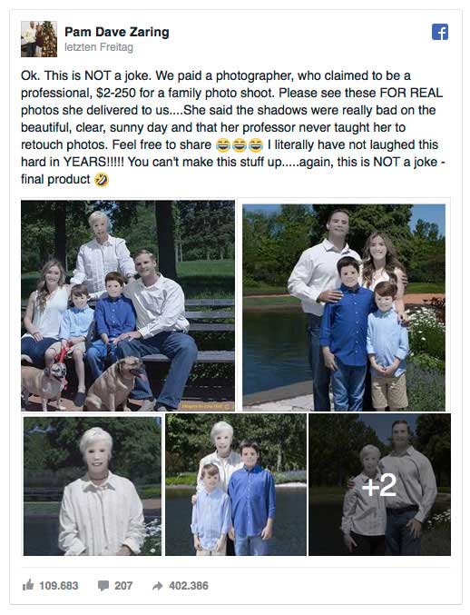 Letzten Freitag teilte die Facebook-Nutzerin Pam Dave Zaring, die Ergebnisse aus einem Fotoshooting und betonte, dass es sich um keinen Scherz handele und es sich um eine echte Auftragsarbeit für 250 Dollar gehandelt habe. Aber sehen Sie selbst.
