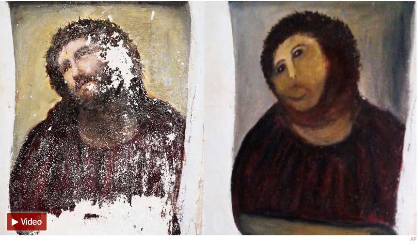 Spiegel Online berichtete 2012 über das Fresko-Fiasko – und angesichts des Ergebnisses glaubte wahrscheinlich jeder zunächst an einen Scherz. Aber die Rentnerin gab es wirklich, und auch ihre gut gemeinte Restaurierung sah wirklich so lustig aus wie in den Meldungen zu sehen war. Das Ganze hatte eine wahre Flut von Memes zur Folge und bescherte der kleinen spanischen Gemeinde und der Kirche mit der drolligen Interpretation des „Ecce homo“ zeitweise eine wahre Flut von Touristen.
