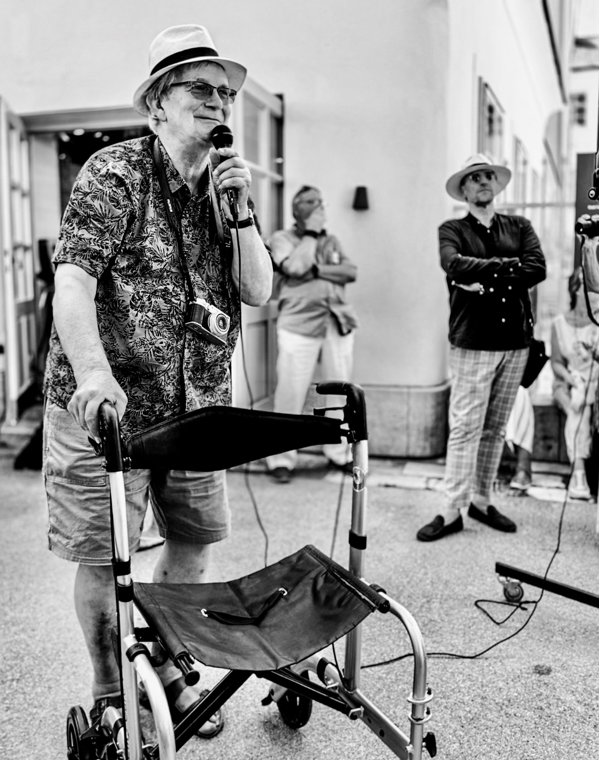 Dass sein Humor, diese typisch britische Mischung aus Trockenheit und subtiler Boshaftigkeit, seine stärkste Waffe war, bewies er bis zuletzt. Wir hatten das Glück hatte, ihn noch einmal im Sommer 2024 beim Fotofestival La Gacilly-Baden zu erleben und wurden Zeuge eines bemerkenswerten Auftritts. Der Körper war sichtlich vom Krebs gezeichnet, die Bewegungen langsamer, doch der Geist war unbezwingbar, der Witz schärfer denn je. Vor seinen Arbeiten stehend, plauderte er mit entwaffnender Selbstironie über seine Art der Fotografie, streute Pointen wie beiläufige Notizen ein und dekonstruierte den Mythos des großen Künstlers mit diebischer Freude.