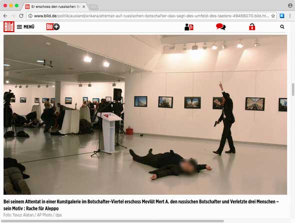 Ich musste unwillkürlich an Thomas de Quincey denken, als ich die Bilder vom Attentat auf den russischen Botschafter in Ankara sah, der bei der Eröffnung einer Fotoausstellung erschossen worden war. Eine türkischer Pressefotograf hatte, während der Mörder mit der Waffe fuchtelte, kaltblütig weiter fotografiert und etliche Medien hatten seine Bilder, teilweise ohne jede Verpixelung des sterbenden Opfers, veröffentlicht.