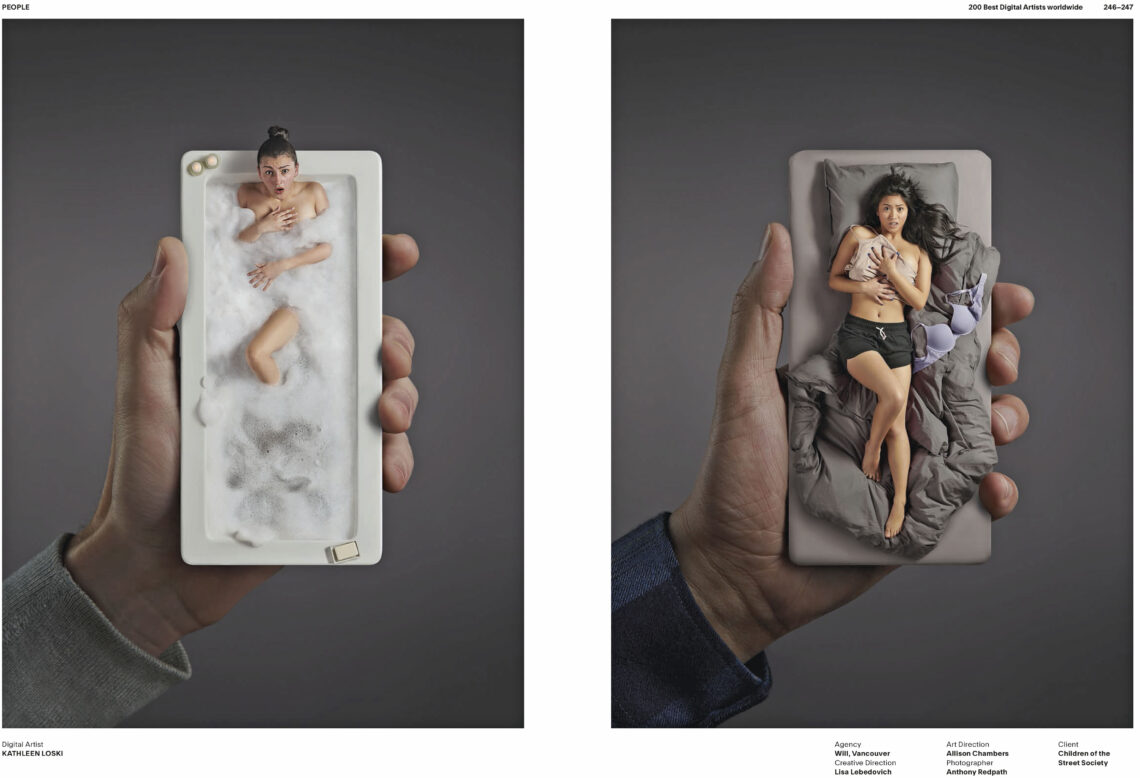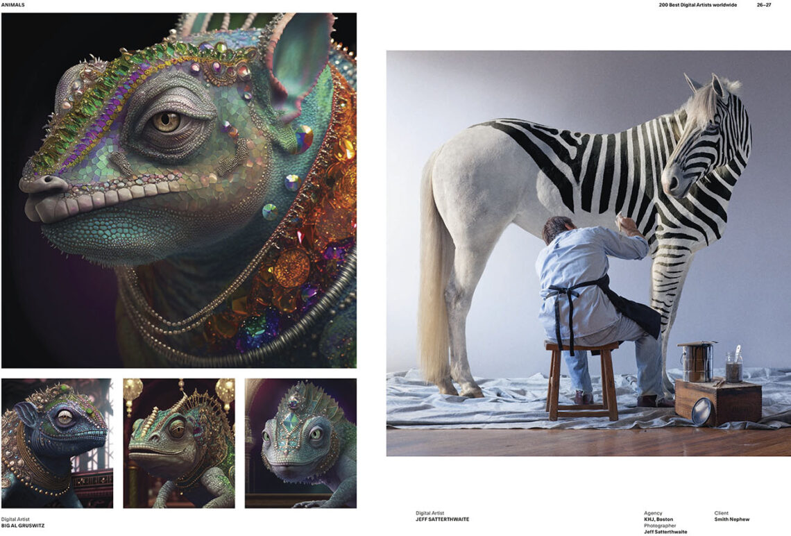 Nachdem kürzlich bei einem internationalen Fotowettbewerb von Sony ein KI-Bild, das als solches nicht gekennzeichnet war, unter 200.000 Einsendungen den ersten Preis in der Kategorie „Kreativ“ gewonnen hatte, stellt sich natürlich auch bei einem solchen Bildband die Frage, ob hier solche Bilder aufgenommen wurden oder wie man sie einschätzt. (Ein Interview mit dem Fotografen und Sony-Preisträger Boris Eldagsen finden Sie in der kommenden DOCMA). Insofern interessierte es mich diesmal besonders, wie die Lürzer-Jury mit diesem Problem umgehen würde. Mit welchen Riesenschritten die Entwicklung voranschreitet, lässt sich schon daran ablesen, dass Verfahren wie digitale Bildbearbeitung und CGI heute fast schon als traditionelle Techniken einzustufen sind, zusammen mit Holzschnitt oder Lithographie.
