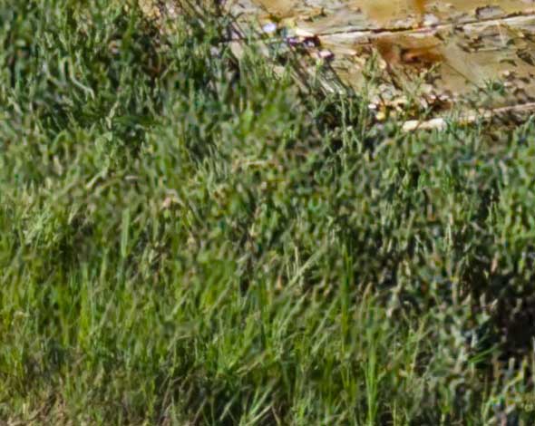 Die Verrechnung der Einzelbilder gelingt noch nicht immer perfekt. In einem anderen Beispielbild offenbart der 1:1-Ausschnitt auffällige Artefakte; im Gras gibt es unplausible Übergänge zwischen Schärfe und Unschärfe: